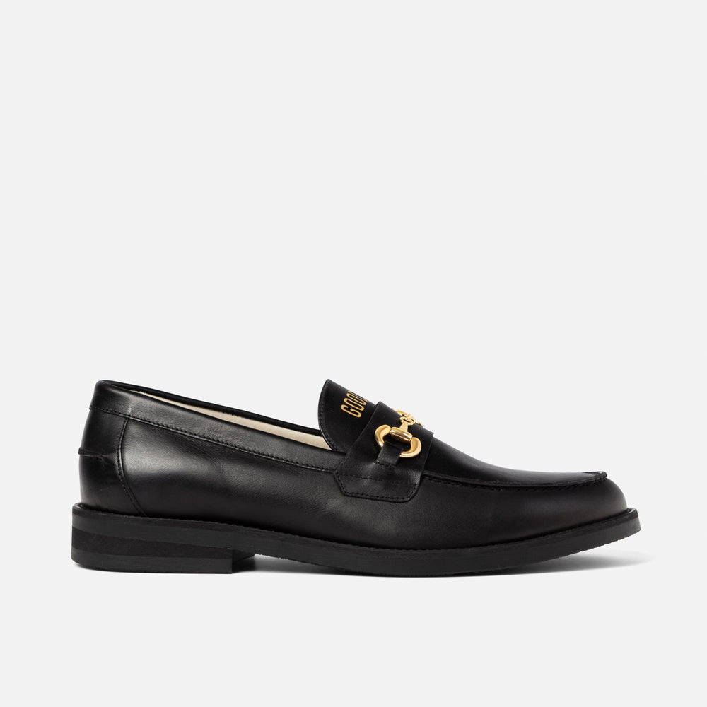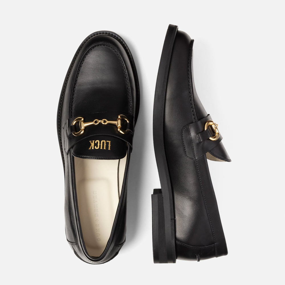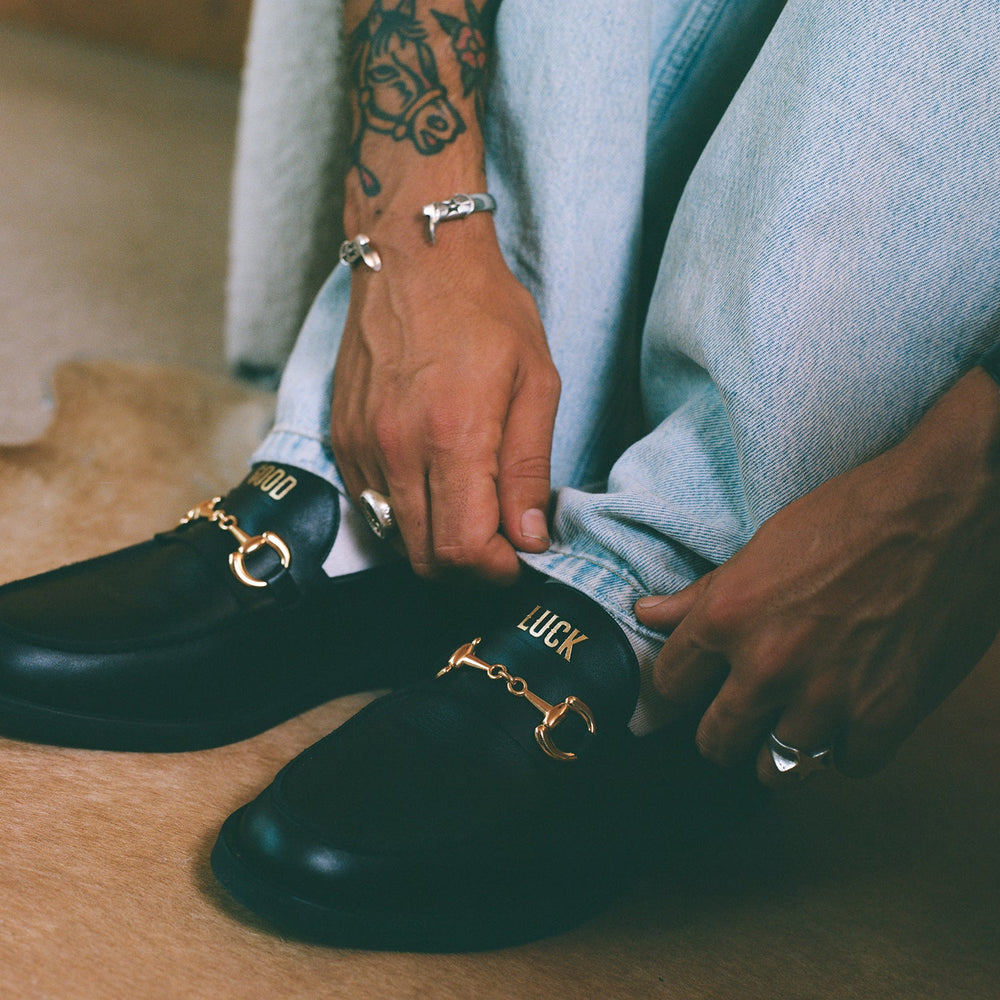 Our Wilde Loafers are pressed with ‘Good Luck’ in gold-tone foil, just above the metallic bits. They’ve been made in Europe from smooth black leather and finished with tonal topstitching. Details include rubber soles, cushioned in-socks and a comfortable leather lining.