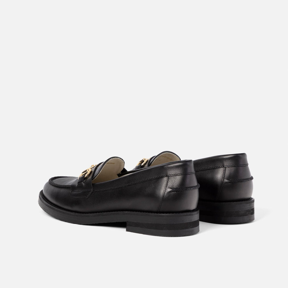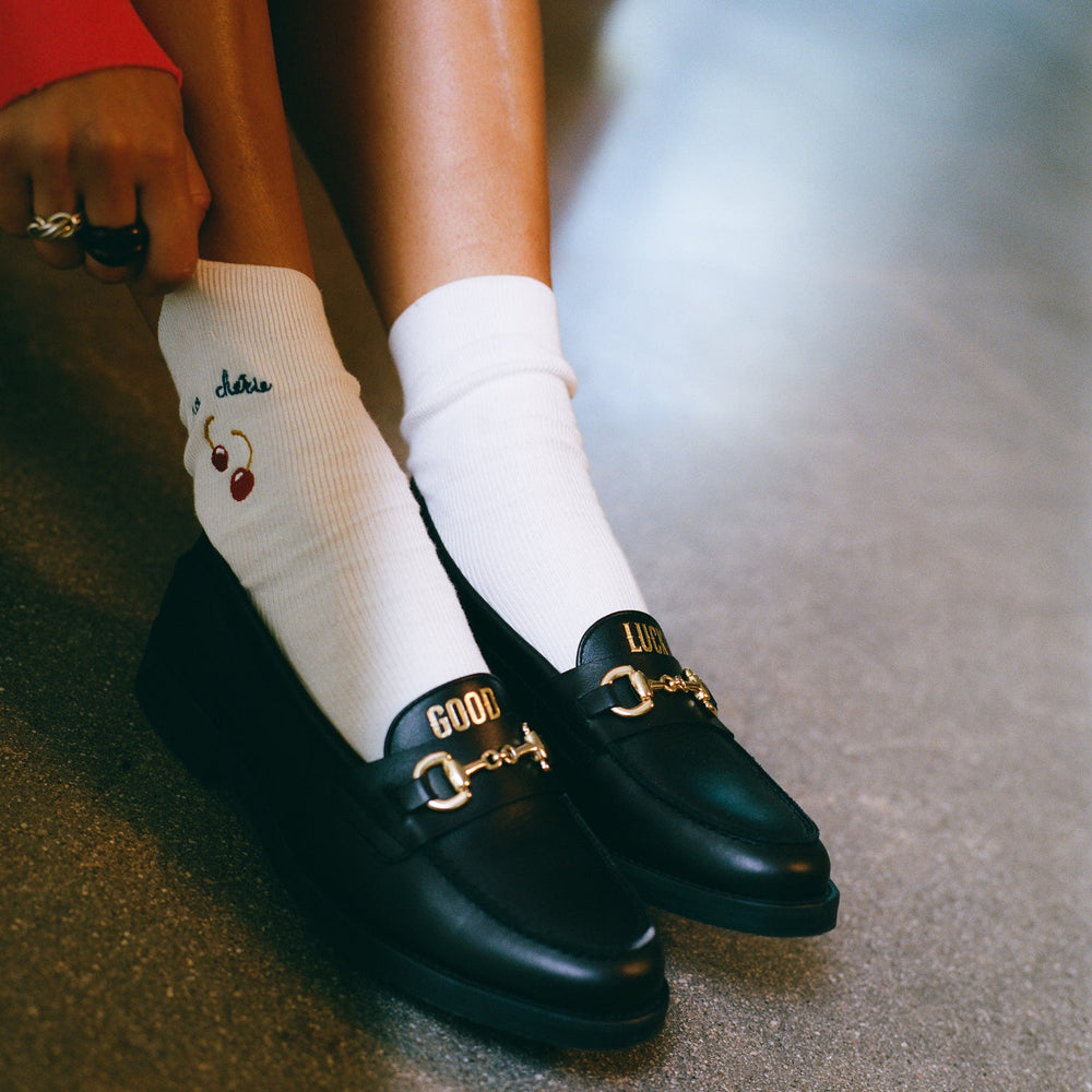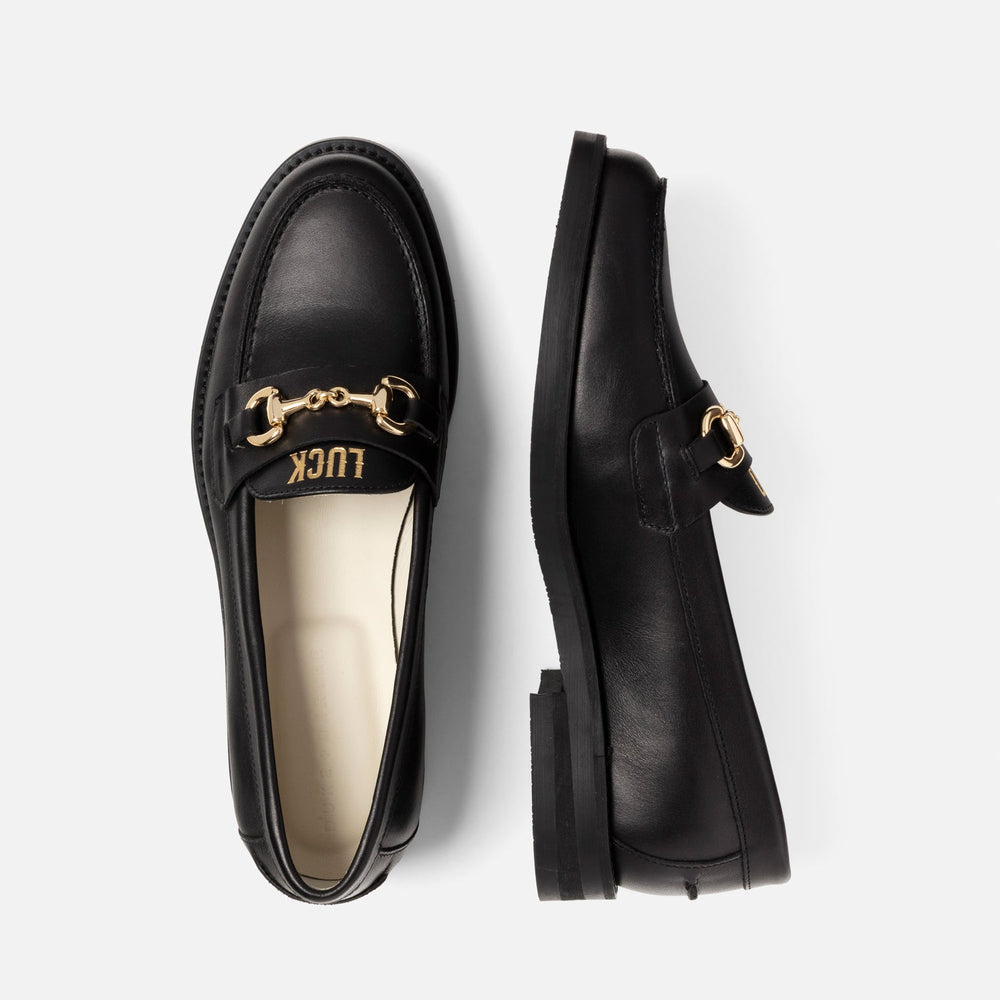 Our Wilde Loafers are pressed with ‘Good Luck’ in gold-tone foil, just above the metallic bits. They’re made in Europe from smooth black leather and finished with tonal topstitching. Details include rubber soles, cushioned in-socks and a comfortable leather lining.