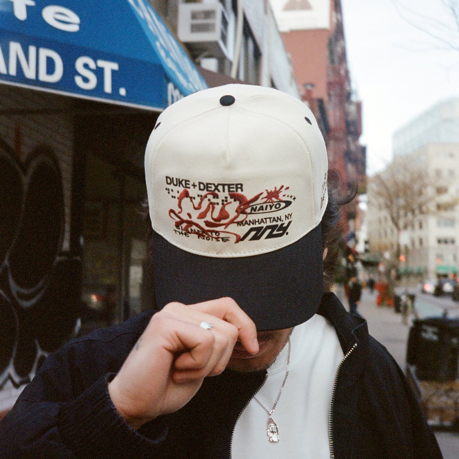 Arriving alongside ‘Blind to the Noise’, an interactive exhibition hosted by Mērcer Labs Museum, the collection features a puff-print tee, an embroidered cap and a duotone Wilde loafer, printed with NAÏYO co-founder Roy Nachum’s ‘Crown Girl’ and ‘Crown Boy’ at the vamps.
