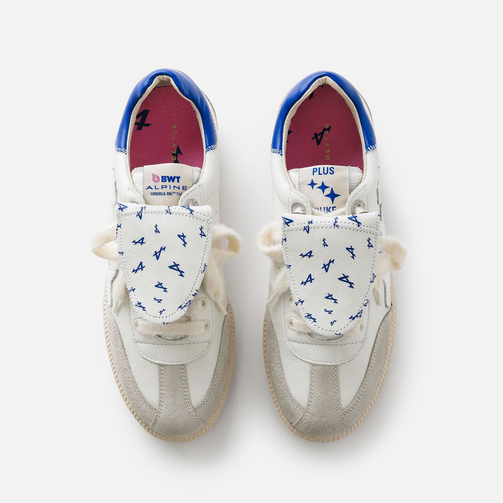 As part of our collaboration with Alpine F1, we’ve updated our Plus Duke Sneakers to match the livery of the A525. They’re made from panels of premium leather and suede and have Alpine blue on the heel tabs and pink on the in-socks. The detachable, embossed tongues are fully reversible, with a monogram on the front, and a gold-tone logo on the back.
