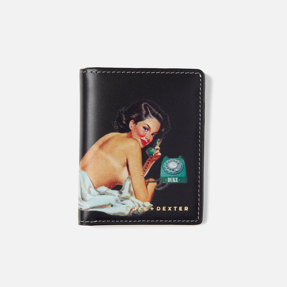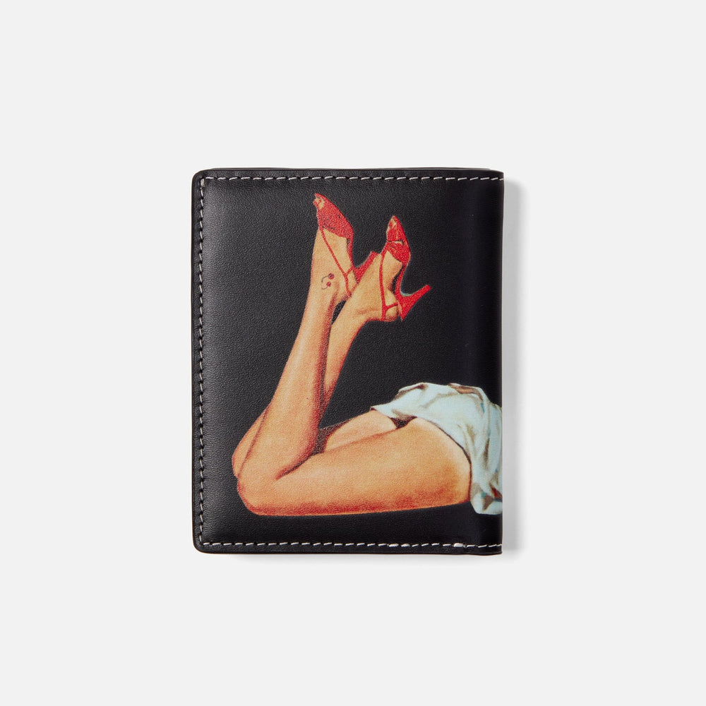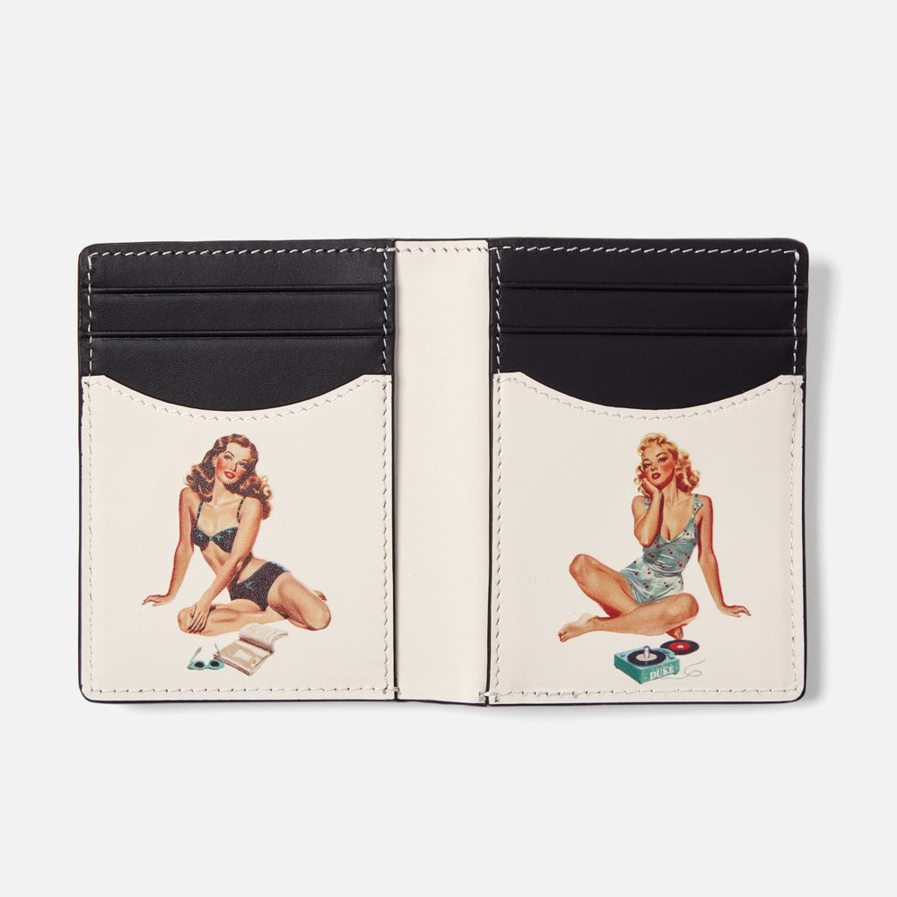 From our Wilde Pin Up Penny Loafers to your back pocket, the Dean Pin Up Wallet has landed. Crafted from leather, featuring a tribute to one of our best-selling Pin Up prints. Completed with six slots for cards and two more lined in nylon at the side with contrast stitching. This accessory arrives as part of the Pin Up Collection.