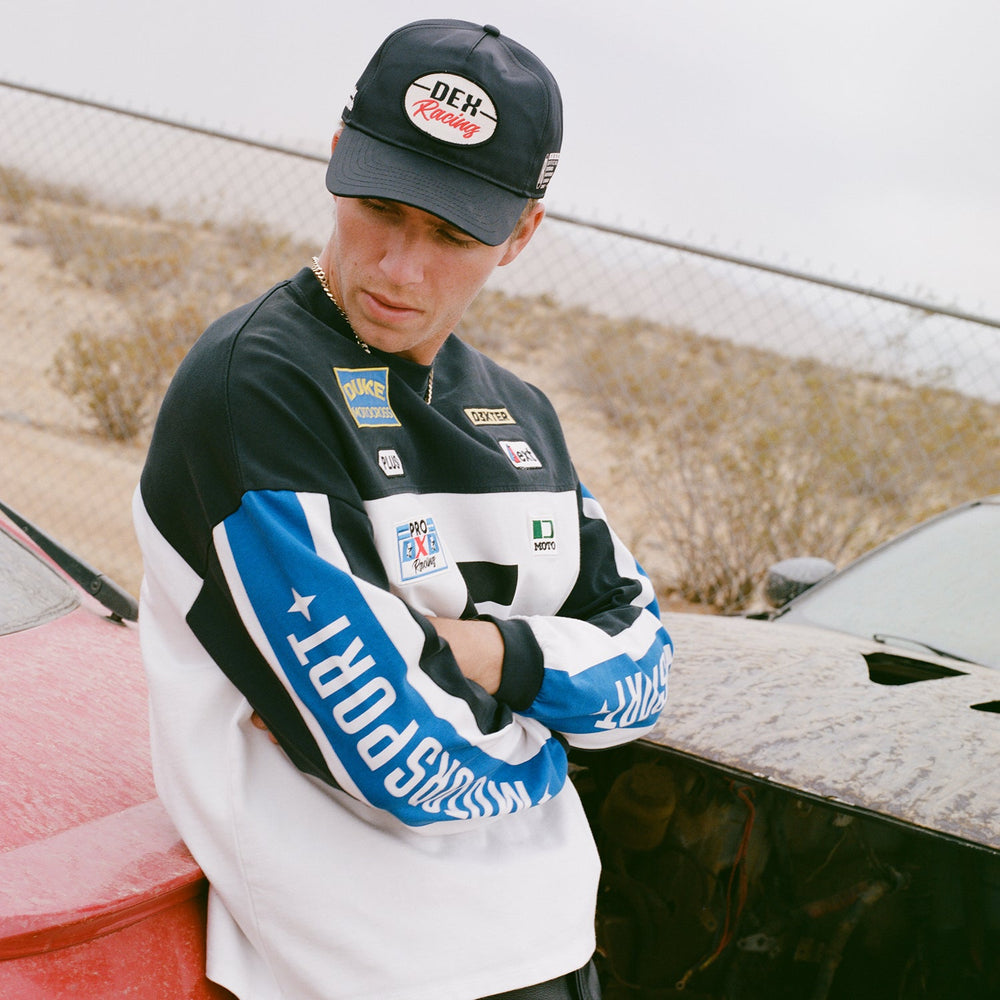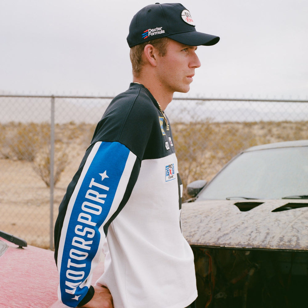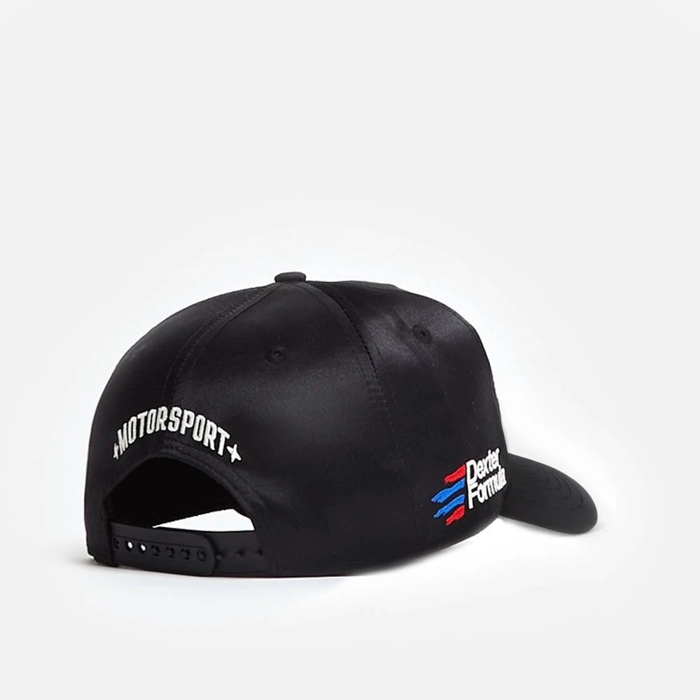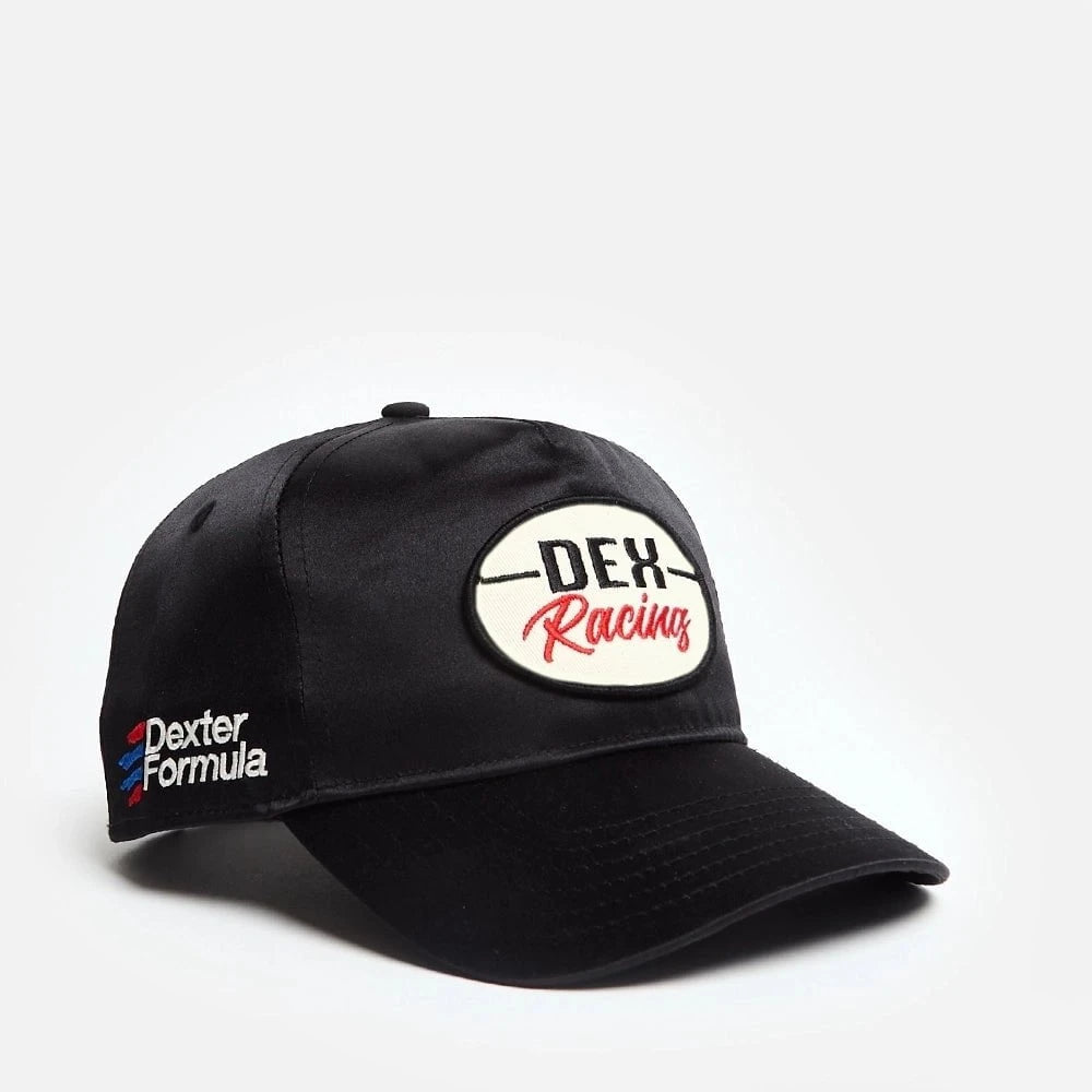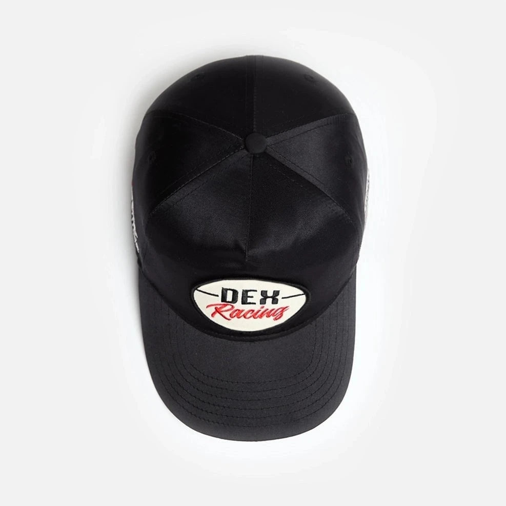 Our Dex Racing Cap is a play on the team styles you’d see at motocross or Moto GP. In a five-panel profile, it’s made from black cotton-twill and embroidered with a patch at the front, like those you’ll find on our Pro Series Jacket.