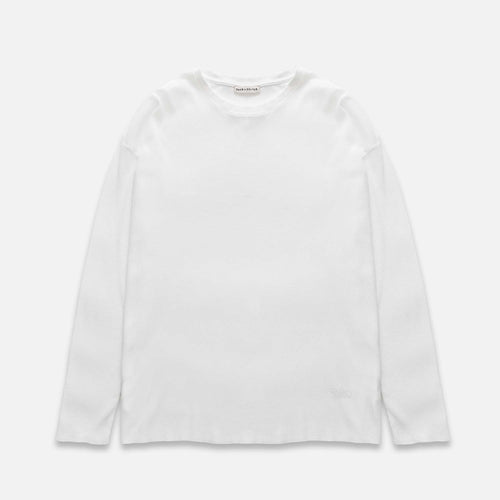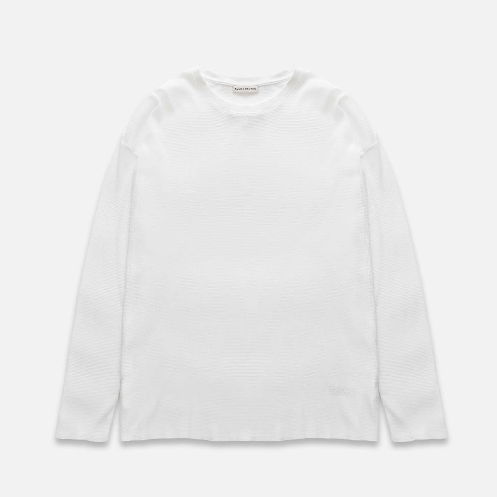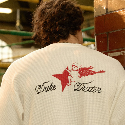 For SS26, our in-house artist, Valentino, has combined two of our favourite motifs: the cherub and the Plus. Seen at the back of this top, it’s waffle-knitted from 320GSM cotton, so it’s a little lighter than our usual, and has a relaxed fit, with ribbing along the edges. There’s a tonal ‘DUKE’ embroidered at the hem.
