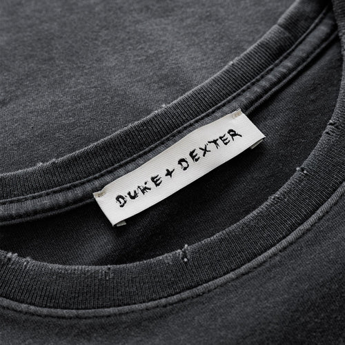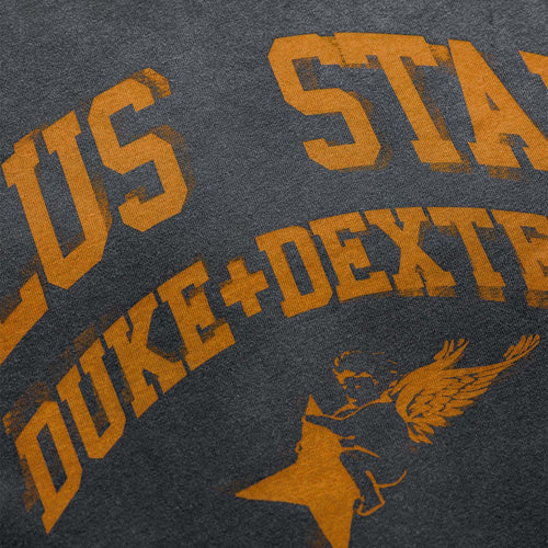 Detail Screen print detail. Sun Faded. Custom hand applied distressing to the neck, sleeve hem and body hem to give an authentic vintage aesthetic