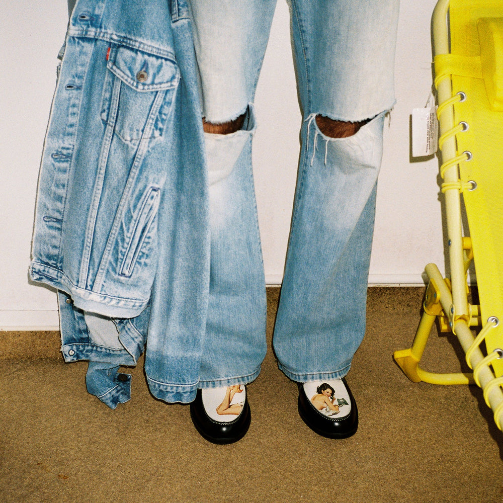 Revisiting somewhere all too familiar, an homage to one of the digitally printed designs that put us on the map. The Women's Wilde Pin Up Penny Loafer, arriving as part of the Pin Up Collection. Featuring a digitally printed contrasting leather vamp, sat atop a 25mm prefabricated TPU sole.