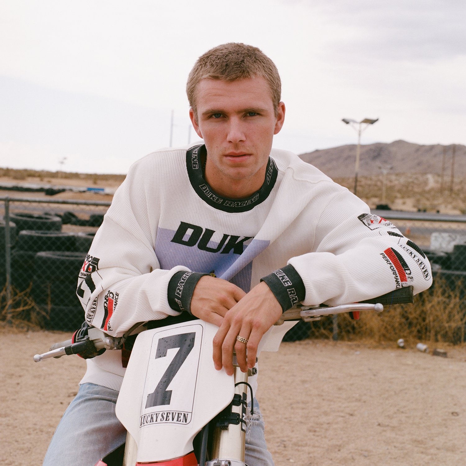 The third instalment of our Duke Racing series. Inspired by the style of motocross and MotoGP. Including screen-printed tees, brush-back hoodies, five-panel caps and custom racing jackets, and our first-ever custom-knitted sweatshirt. Screen-printed and jacquard-knitted with fan-favourite graphics, hand-drawn by the team in Brixton.