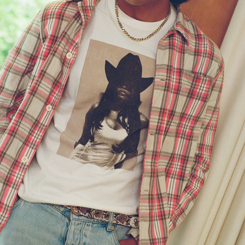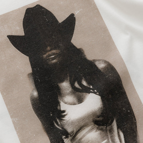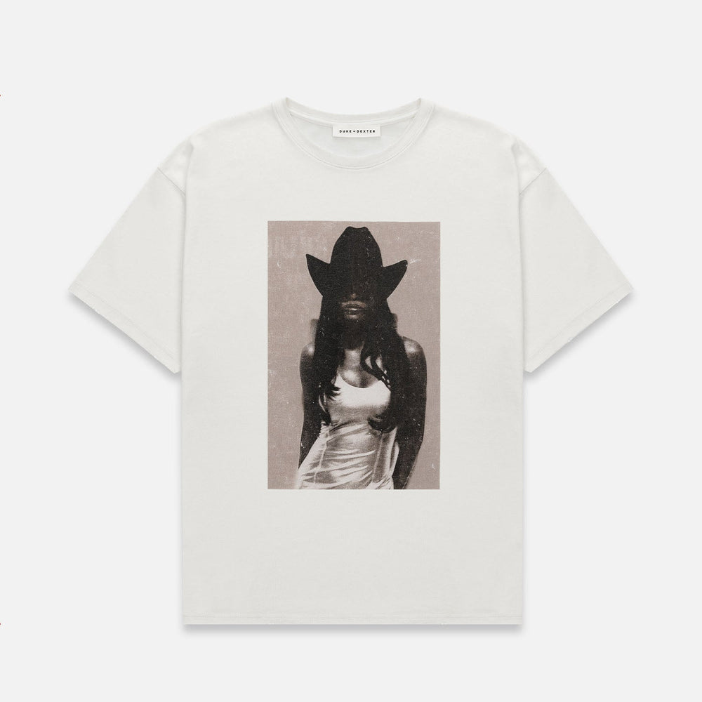 This Vintage White T-Shirt is printed with our Duke Cowgirl graphic at the chest. With the collection’s title at the back, it’s made from 220GSM cotton-jersey that’s washed and sun-faded for a naturally worn-in look and feel.