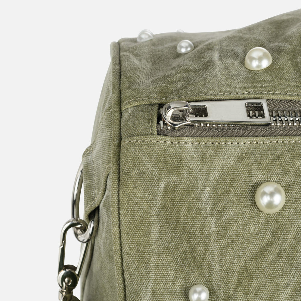 Detail Pearl beading. Zip up closure. Removable adjustable strap. Internal storage compartment