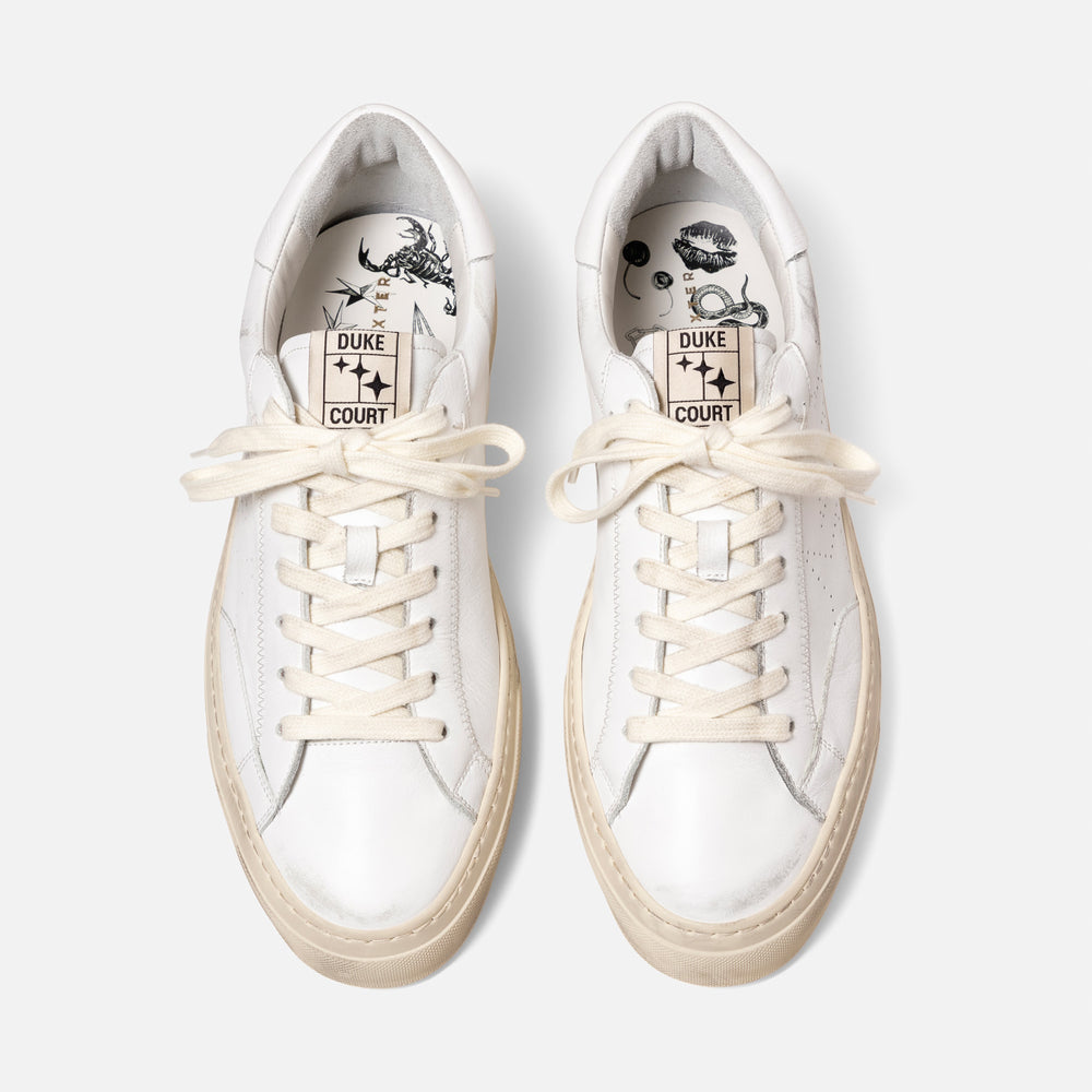 The Plus Court White Distressed sneaker is crafted in Europe from Italian leather and set on custom rubber cup soles, intentionally aged to look like authentic vintage. Each pair is specially designed to capture the lived-in feel that runs throughout our collections. The soles are finished in off-white for subtle contrast, and the lining is soft towelling as a callback to pairs of the past. Cushioned insoles means the Plus Court is built for ultra all-day comfort.