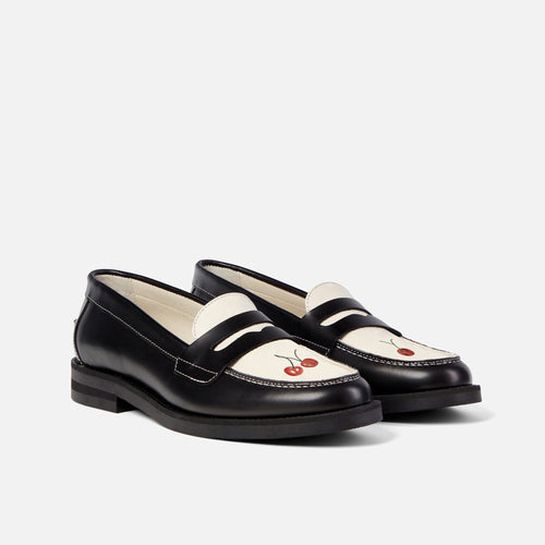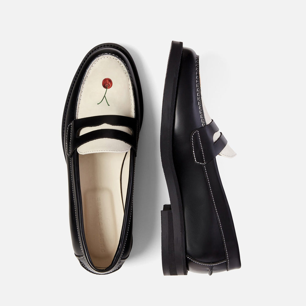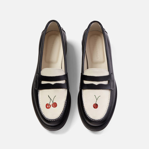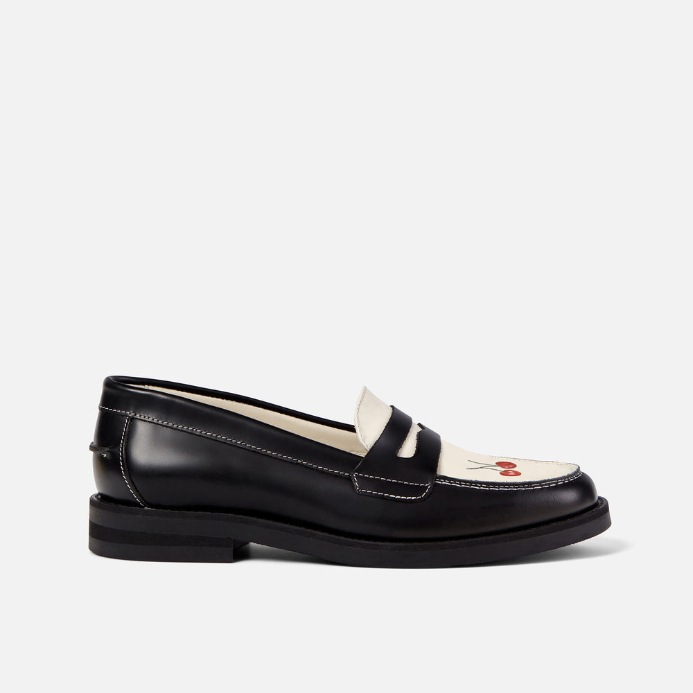 For LDN II NYC, our Head of Brand Artistry, Jess, recreated our signature Cherry, with stems that spell out NY. Printed at the front of these duotone pennies, they’re made from contrasts of black and white leather and set on 25mm prefabricated soles. Details include cushioned in-socks and a smooth leather lining.