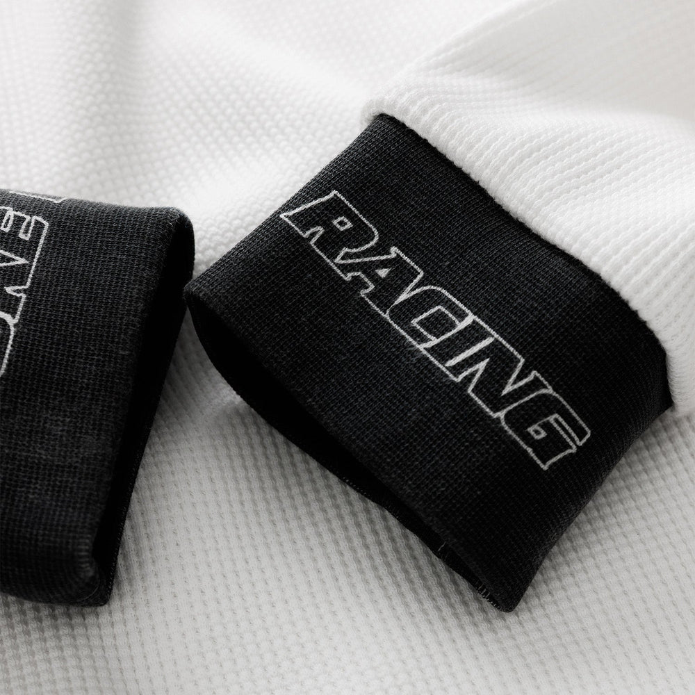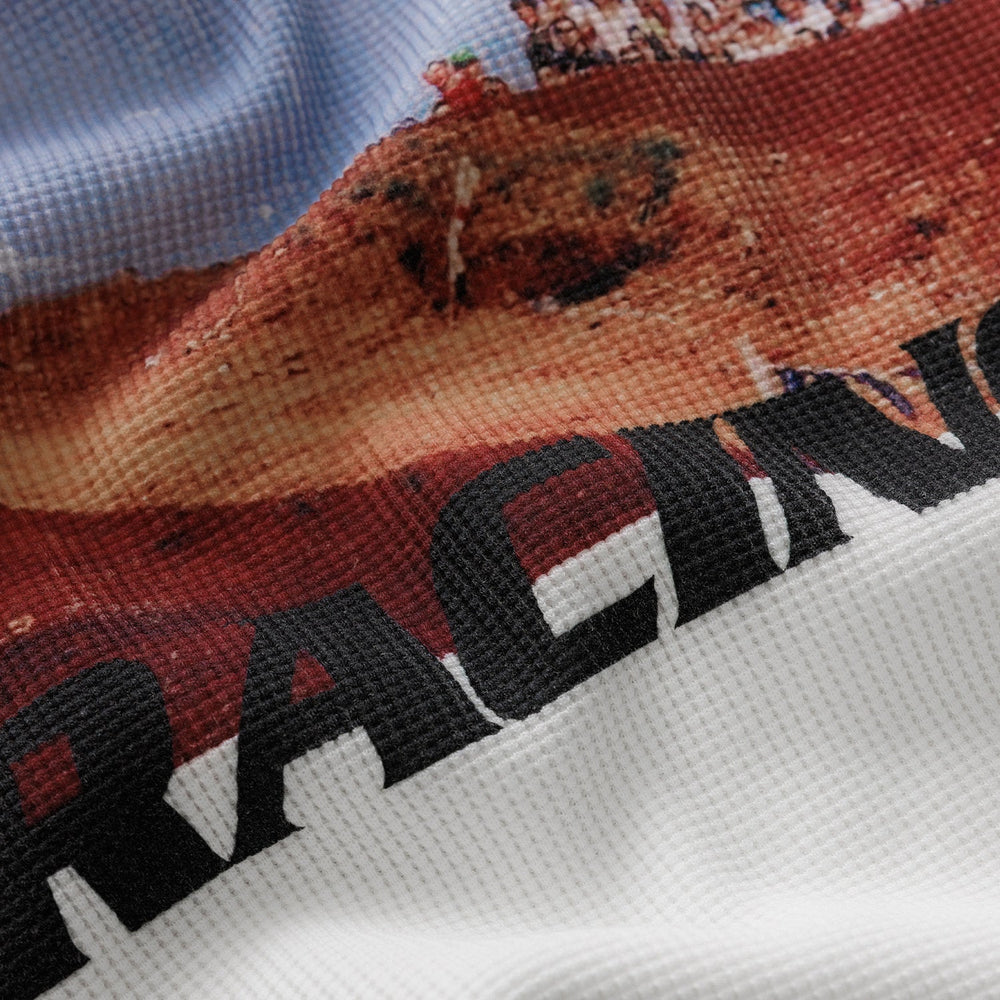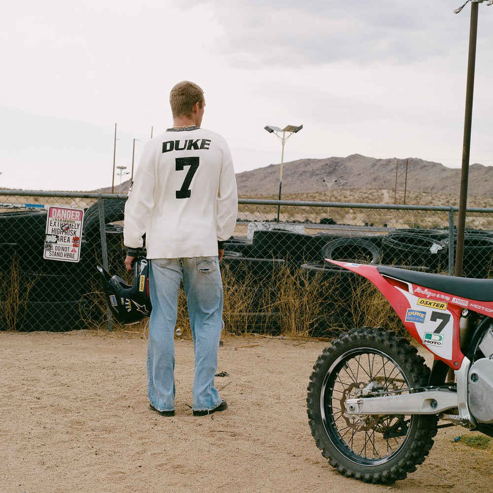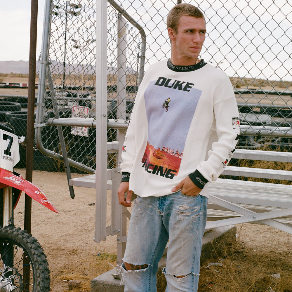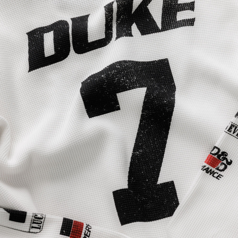 Our DR3 Motocross Top is modelled on an undershirt from the 1990s. Knitted in a waffle stitch, it’s made from midweight 390gsm cotton and has faded, water-based graphics across the back, chest and sleeves. The ribbed trims are lifted from vintage styles, with printed Duke Racing spell-outs throughout.