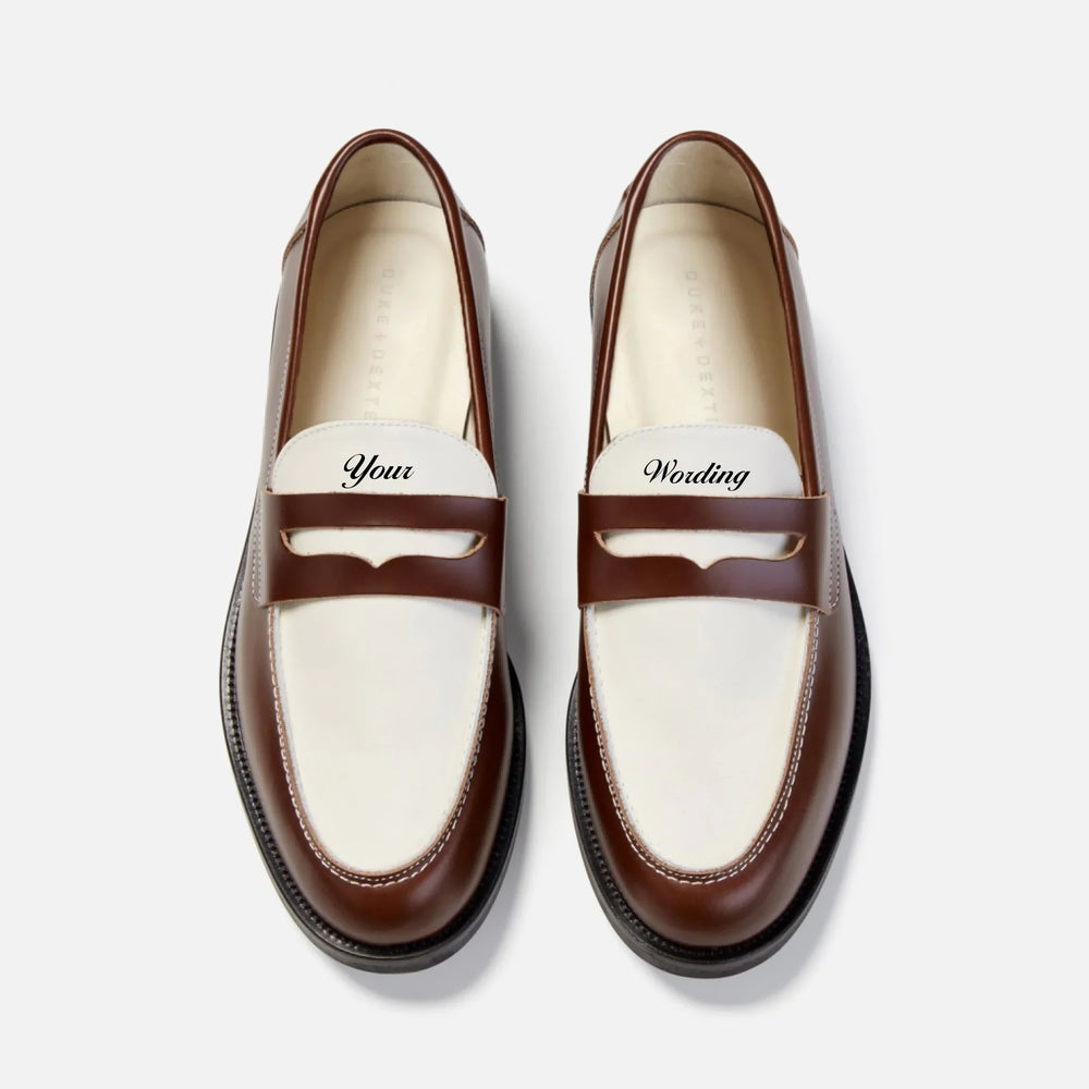 Any word or phrase, hand-painted by our in-house artist Katie onto the top of the vamp of your Wilde Penny Loafer, in any colour you choose.