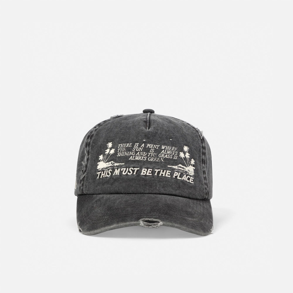 Our five-panel cap is embroidered with the title of our SS25 collection, This Must Be The Place. It’s made from a washed, distressed and worn-in cotton-twill to give it an aged aesthetic. Including a padded headband and a snapback strap.