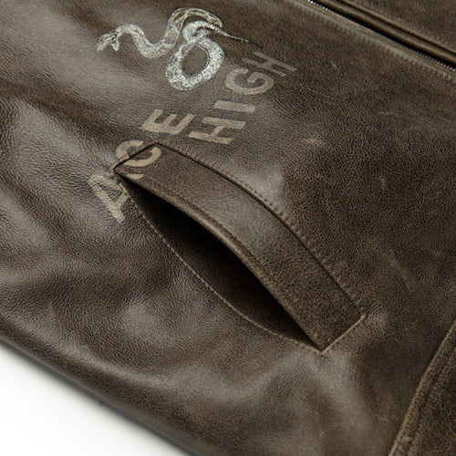 This Hand-Painted Leather Jacket is handmade in England and limited to 4 units. Made-to-order from distressed leather supplied by a Shoreditch-based merchant just a few miles north of our Brixton HQ, it’s cut like a blouson with a silver-tone RiRi zipper and adjustable snaps at the cuffs, and is fully lined in satin for easy layering over sweaters and T-shirts. The jacket has been finished by our 1OF1 artist, Kate, who has hand-painted it with Western-inspired illustrations pulled from our Ace High campaign. The artwork is fully waterproof and scratch resistant.