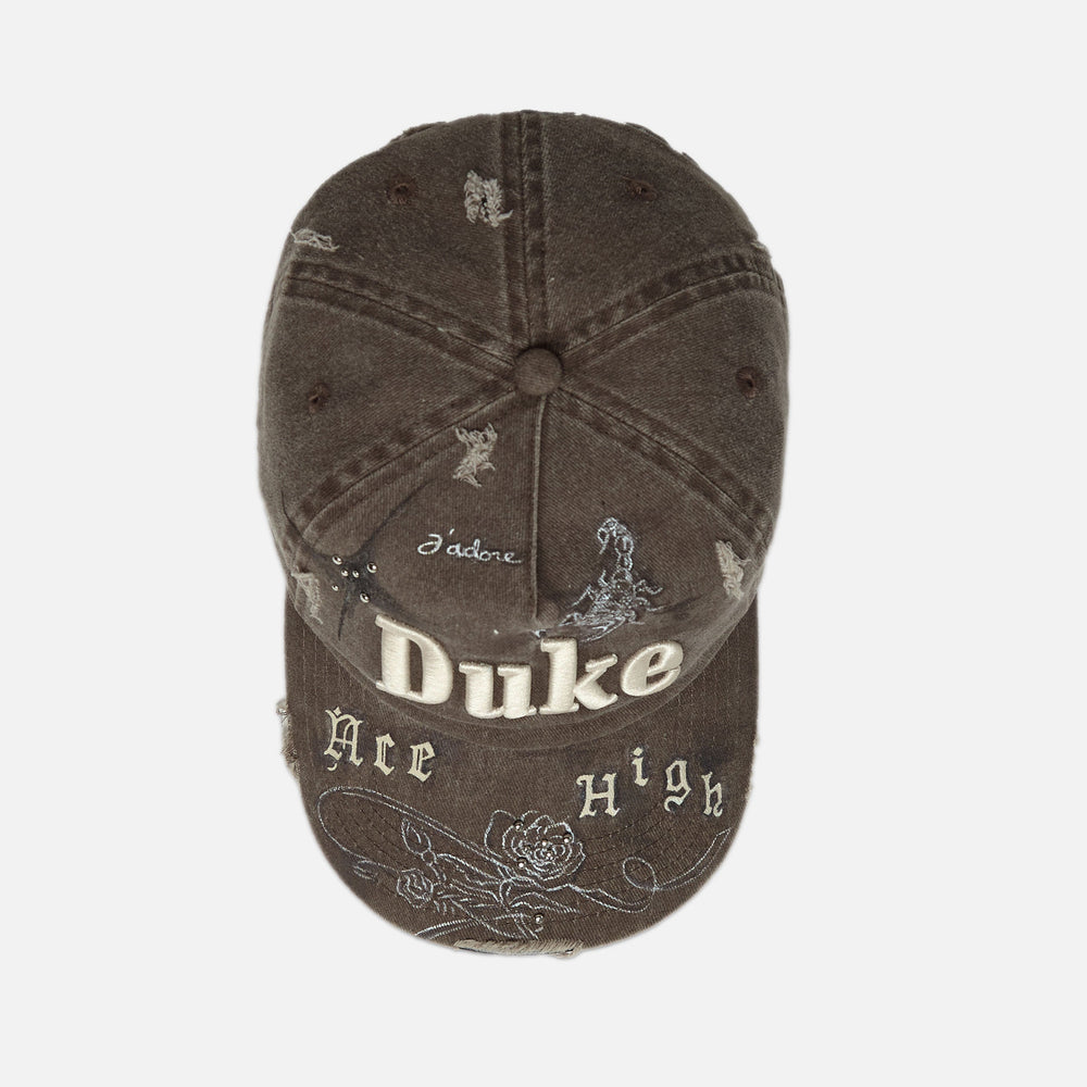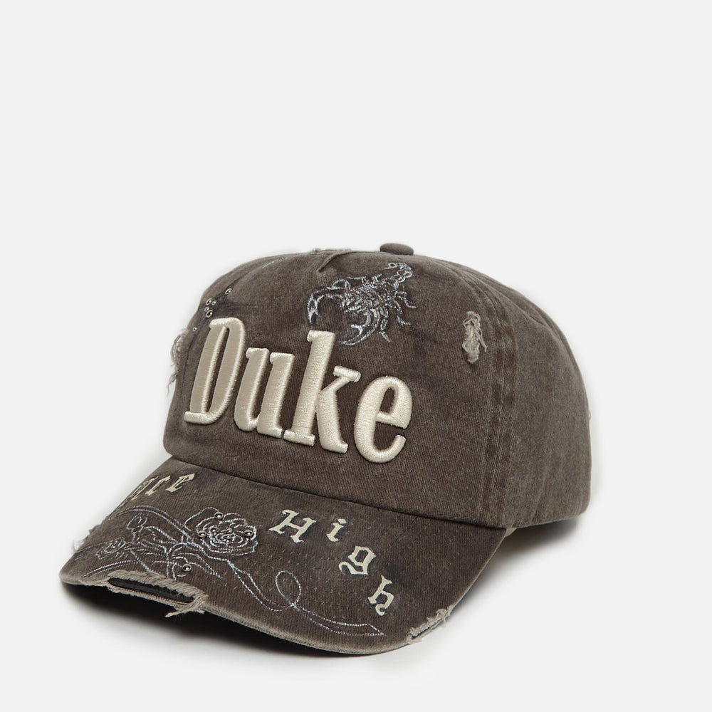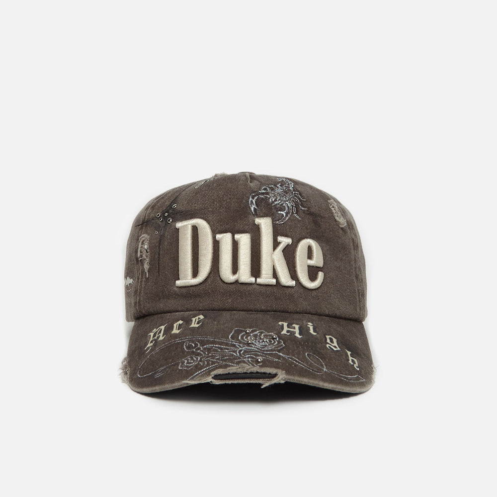 This Custom Cap is limited to 3 units only. An ode to our Ace High campaign, it’s hand-painted with the collection’s name in Old English lettering and constructed from five panels of washed and distressed cotton-twill. Customised with D+D icons, hand-punched studs and 3D embroidered ‘DUKE’ across the crown, it features a soft, padded headband and an adjustable snapback strap.