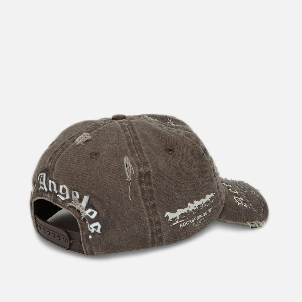 Detail Made to order. Hand painted. Unstructured Cap. Embroidered and screen printed logos. Padded Headband. Snapback Closure, distressing all over