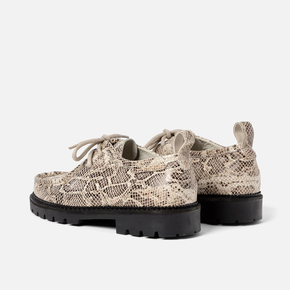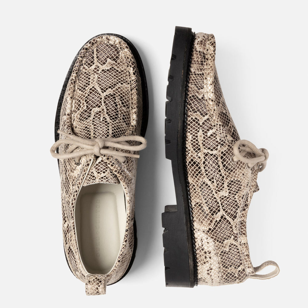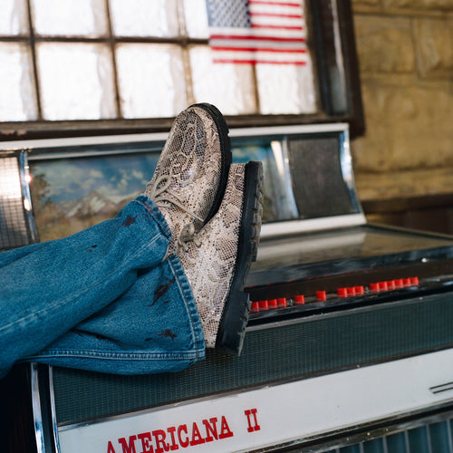 As part of our Ace High collection, we’ve reimagined our Moby Boots in a number of Western-inspired fabrics, like faux snakeskin and pony hair. This Brown pair is made from Italian snake-effect leather and has crimped uppers and rubberised commando soles. It’s finished with cotton laces, cushioned in-socks and a pull tab at the heel.
