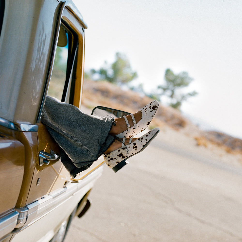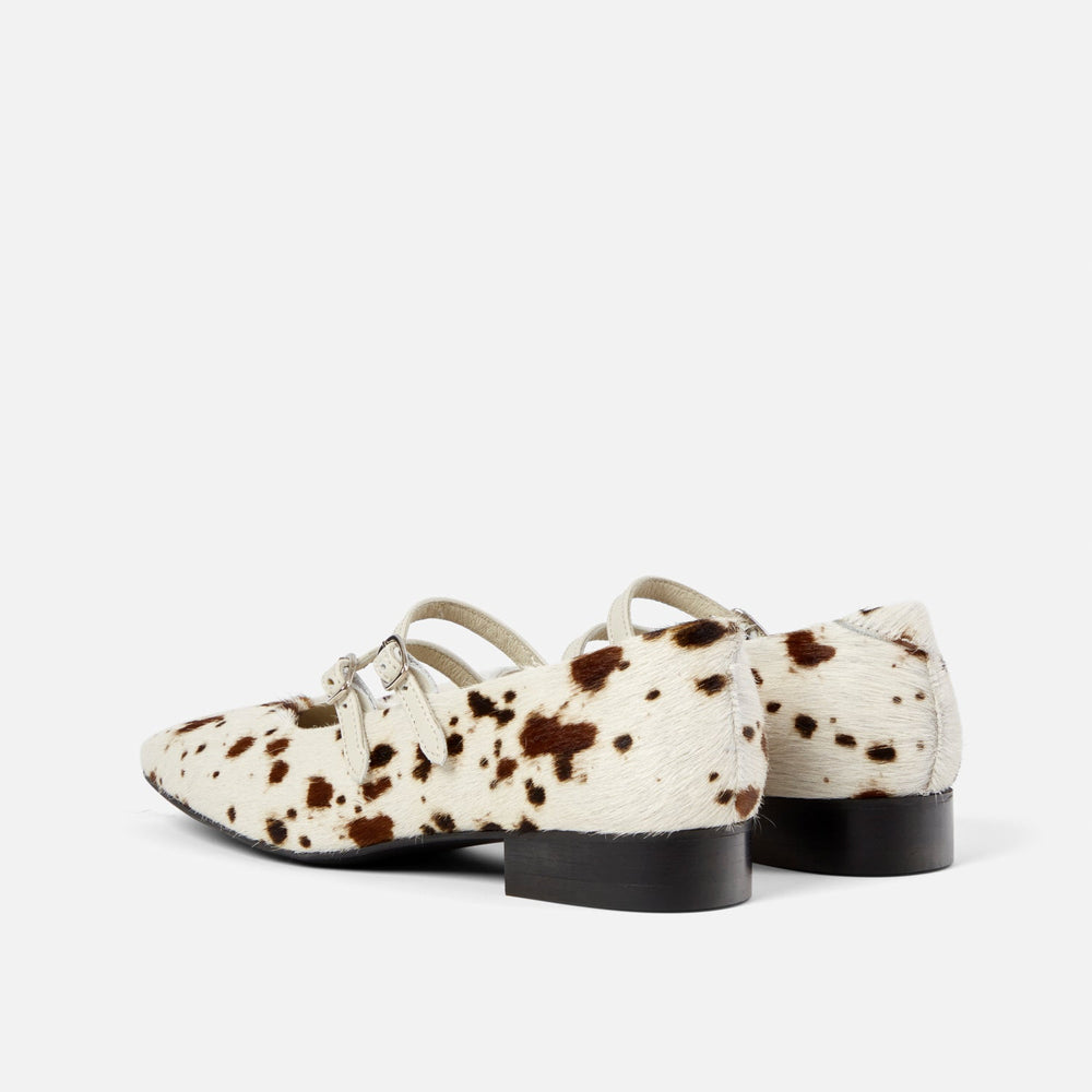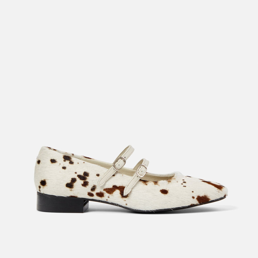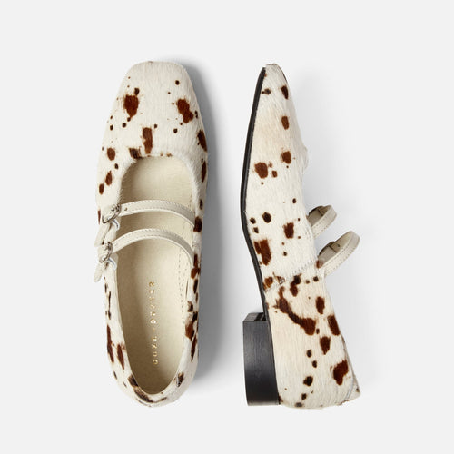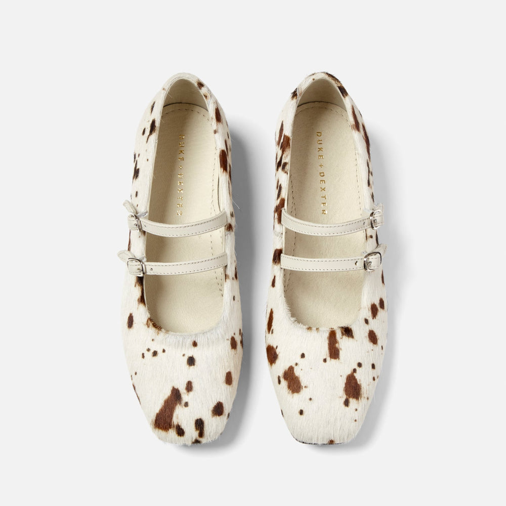 Part of Ace High, these Ruby Mary Janes are made from pony hair that’s mottled with brown spots. Set on 25mm neolite soles, they have a rounded silhouette and two straps across the top.