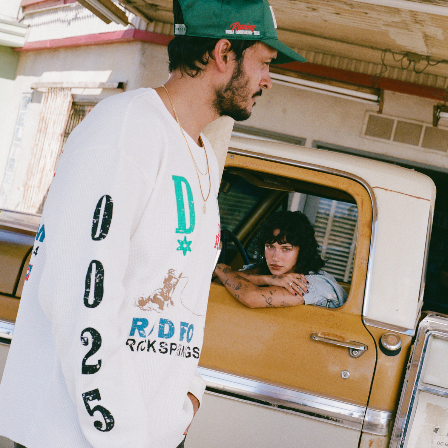 Ace High is an ode to the American West. Featuring footwear, apparel and accessories, updated in Western-inspired textiles like cow-print, pony hair and snake-effect leather and printed with ranch and rodeo-themed artwork from in-house artist, Valentino.