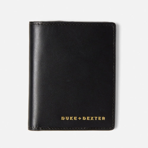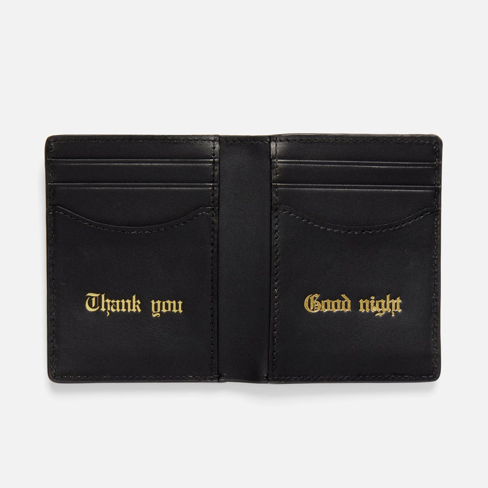 This Dean Wallet is made from black leather and stamped with ‘Thank You, Good Night’ in gold-tone foil. It has a slim, billfold construction with tonal stitching at the edges and opens to half-a-dozen slots and a pair of pockets for notes and receipts.