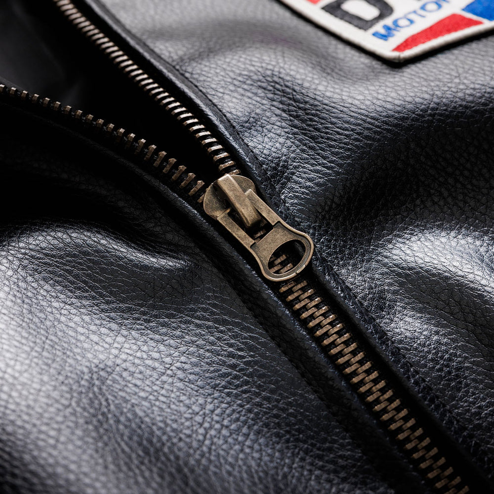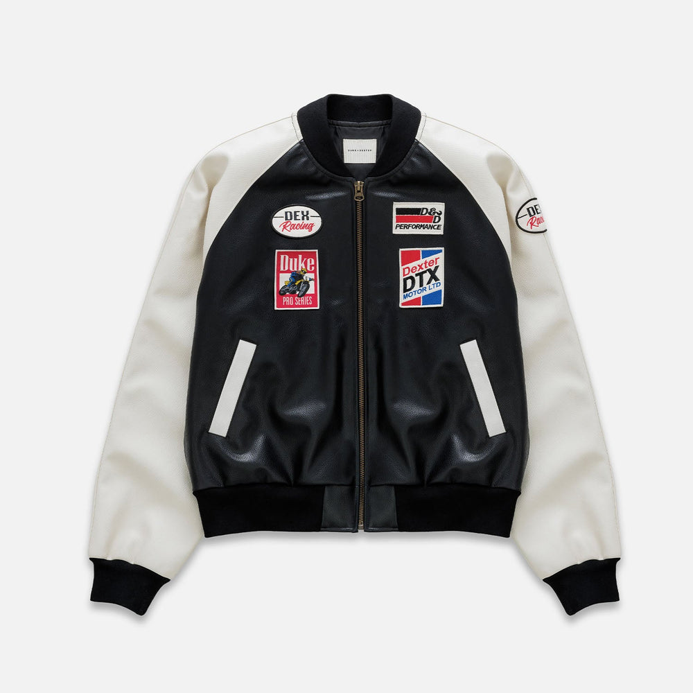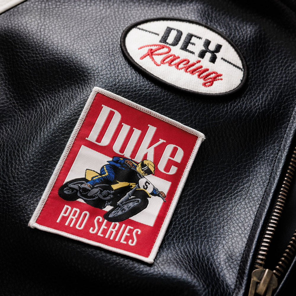 Detail Inspired by vintage Moto GP jackets, this style has many panels of contrasting leathers, appliqué text and embroidered patches on the body in our signature duke racing artworks