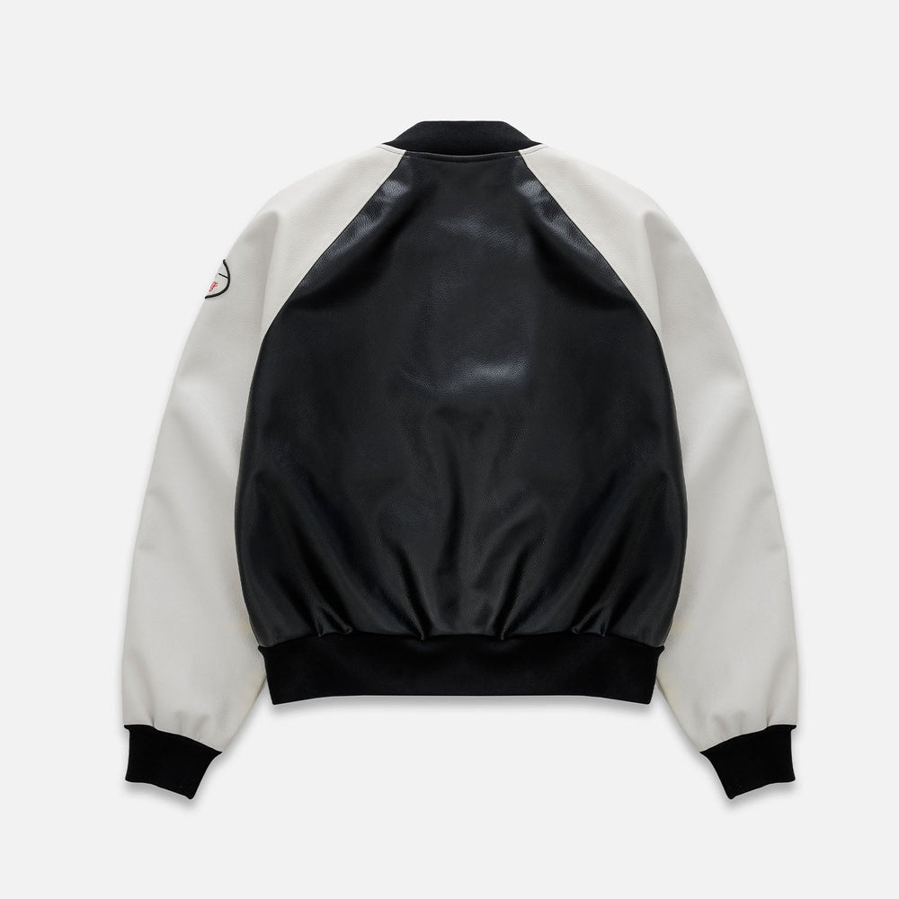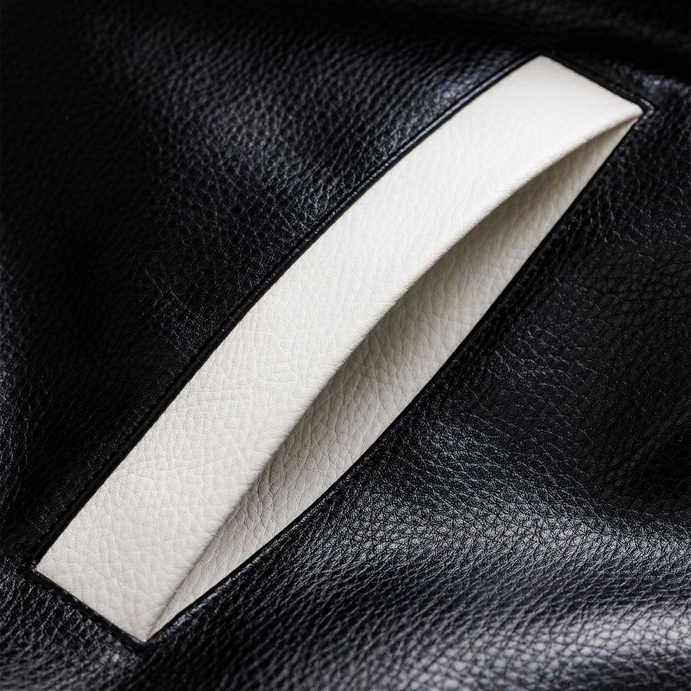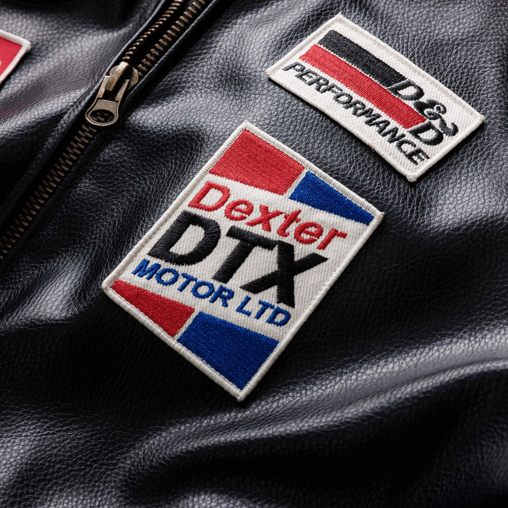 The DR3 Pro Series Jacket is modelled on an archive piece from the late 1980s. Cut in a cropped, bomber-inspired profile, it’s made from black faux pebble-leather and has white faux pebble-leather sleeves. The embroidered and woven patches have been customised by the team in Brixton, and individually placed to capture the look of vintage motorsport. Details include an antiqued zip, internal pockets and a full satin lining.