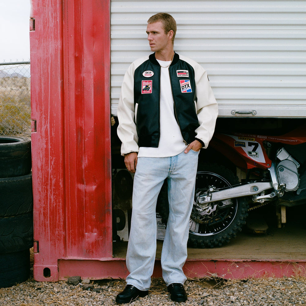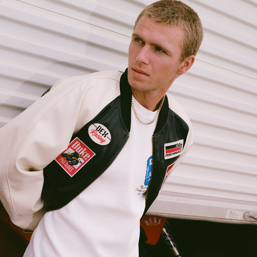 The third instalment of our Duke Racing series. Inspired by the style of motocross and MotoGP. Including screen-printed tees, brush-back hoodies, five-panel caps and custom racing jackets, and our first-ever custom-knitted sweatshirt. Screen-printed and jacquard-knitted with fan-favourite graphics, hand-drawn by the team in Brixton.