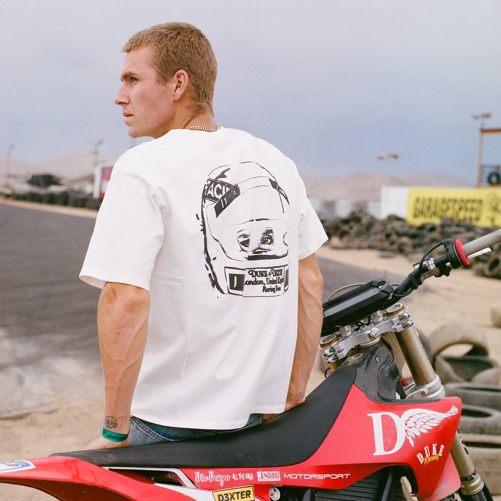 The third instalment of our Duke Racing series. Inspired by the style of motocross and MotoGP. Including screen-printed tees, brush-back hoodies, five-panel caps and custom racing jackets, and our first-ever custom-knitted sweatshirt. Screen-printed and jacquard-knitted with fan-favourite graphics, hand-drawn by the team in Brixton.