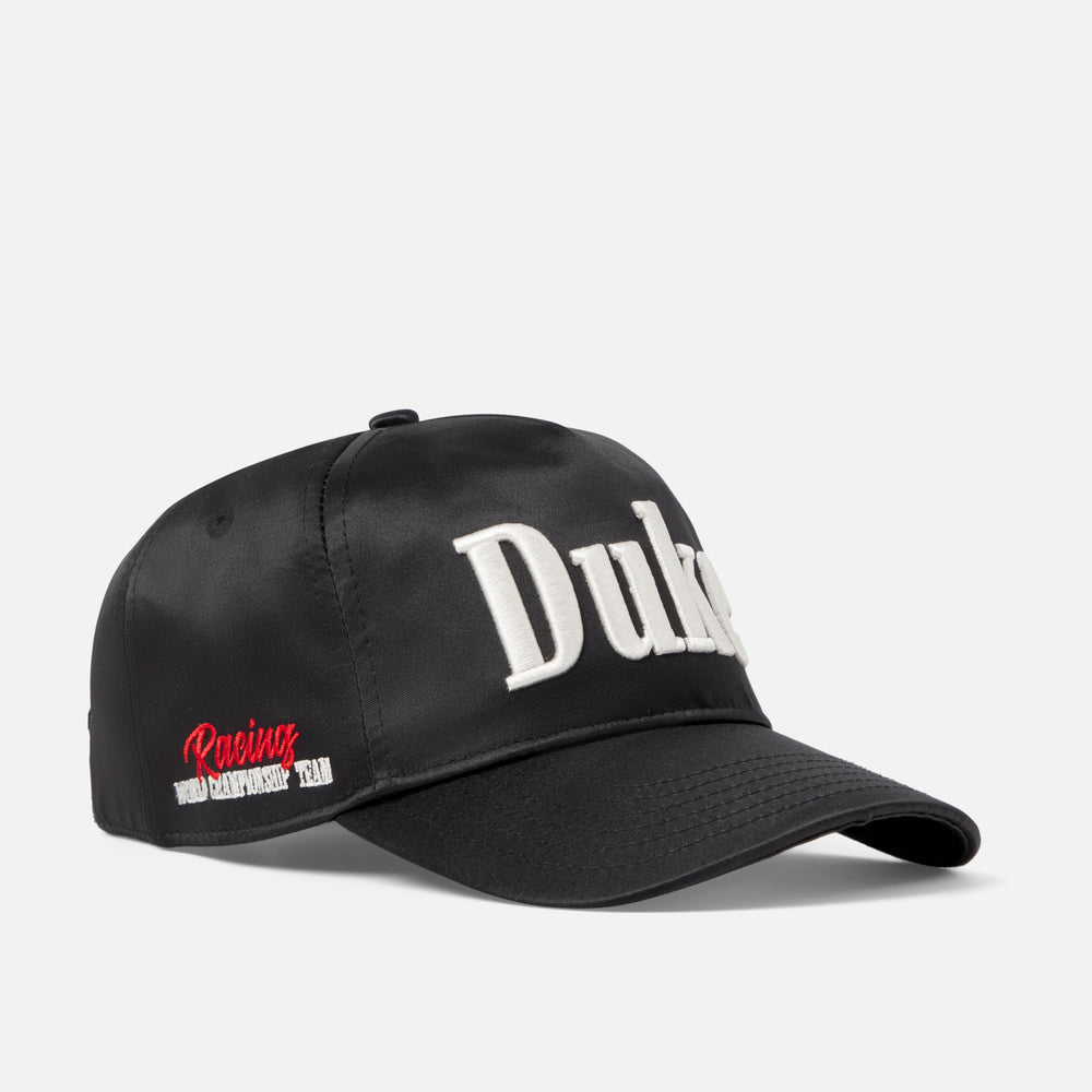 Stealth. An all black satin cap with DUKE embroidered to a 3D effect across the crown, padded headband and World Championship detailing to the side. This is the DR2 Duke Black Cap, a first for D+D.