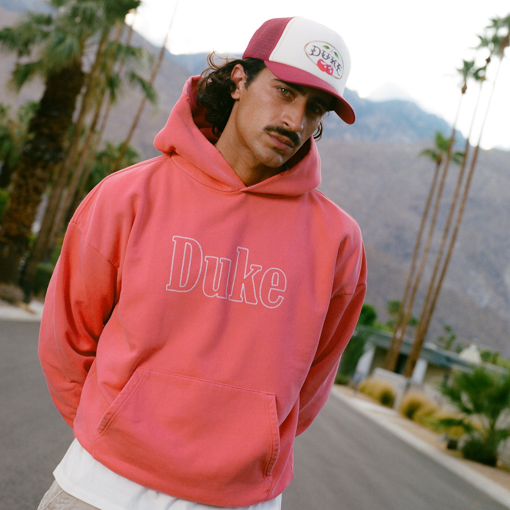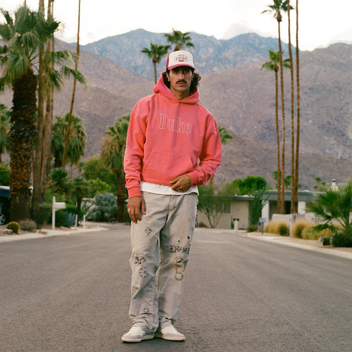 Part of Ace High Pt. 2, this hoodie is chainstitched with ‘Duke’ across the chest. It’s made from 420GSM brush-back cotton-jersey and comes in a faint red, achieved through extensive washing and sun-fading.