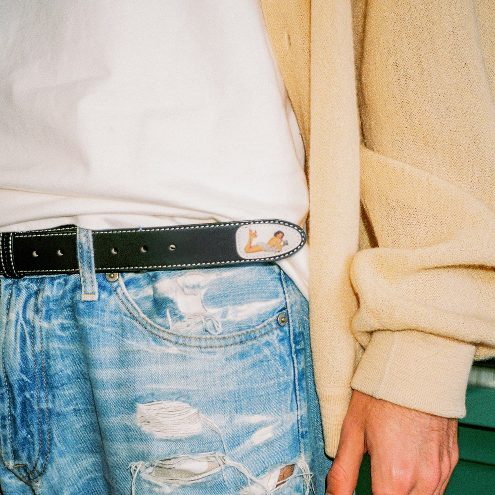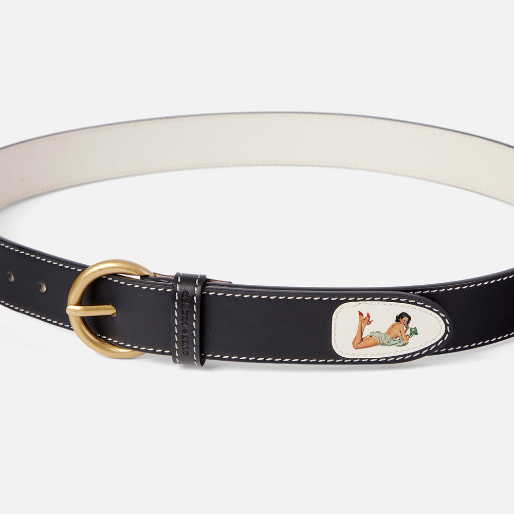 The digitally printed Ellis Pin Up leather belt. To be paired with your favourite pieces from the Pin Up Collection, or to be worn solo. Featuring a Pin Up Sketch printed onto the white leather belt tip.
