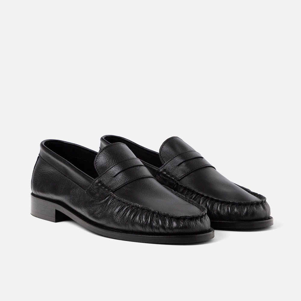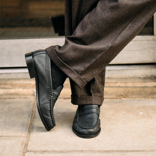 Our Ezra Black Loafers are pleated at the aprons to demonstrate the softness of the hide. They’re handmade in Europe from a tumbled, grained, and unlined leather and have 25mm rubber soles that are finished with a Blake stitch – the preferred construction of Italian makers and designers. Details include custom, cushioned in-socks and a tonal Plus stitch at the heels.