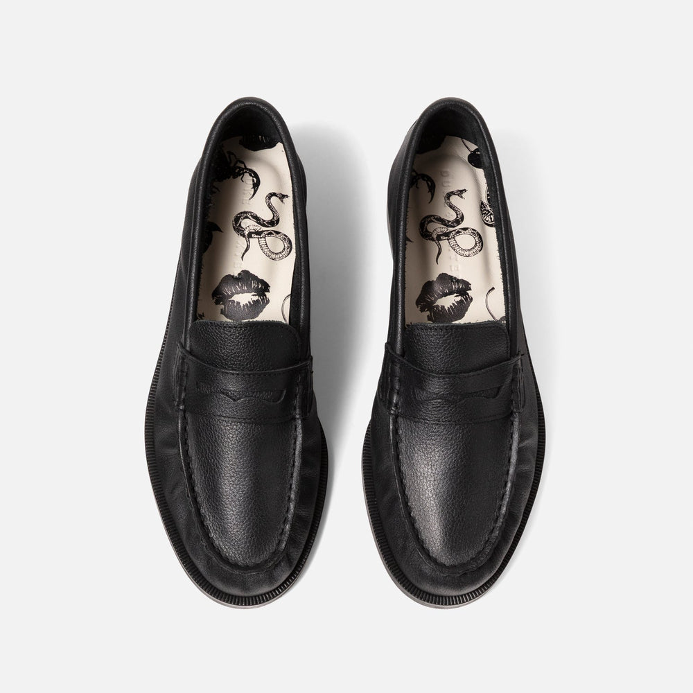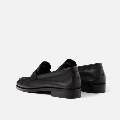 Our Ezra Black Loafers are pleated at the aprons to demonstrate the softness of the hide. They’re handmade in Europe from a tumbled, grained, and unlined leather and have 25mm rubber soles that’re finished with a Blake stitch – the preferred construction of Italian makers and designers. Details include custom, cushioned in-socks and a tonal Plus stitch at the heels.