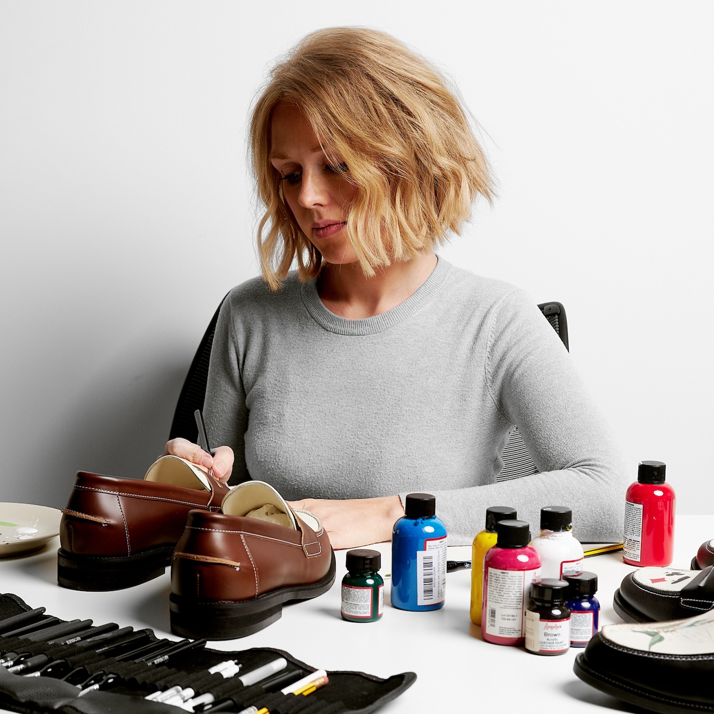 Meet Katie. Our in-house artist behind each pair of your custom D+D orders. Ready to bring your ideas to life. We love to make shoes that no one else can. So, we founded 1OF1. Because that's exactly what it is. Painted by hand or embroidered, Sneakers or Wilde Penny Loafers. For you and no one else.
