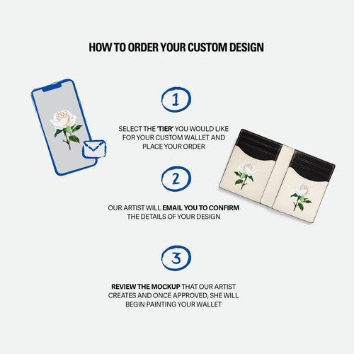 Step One - Select which tier level you would like for your custom wallet. This determines how detailed you would like your custom artwork to be - you can see examples of the tiers in the images on this page. Then place your order.