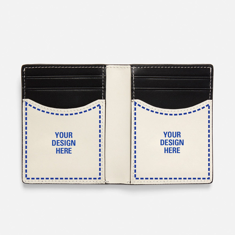 Tier 2 Simple illustration on 2 sides of the wallet, including logos, large letters or more simple designs.