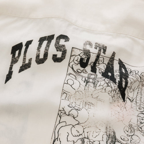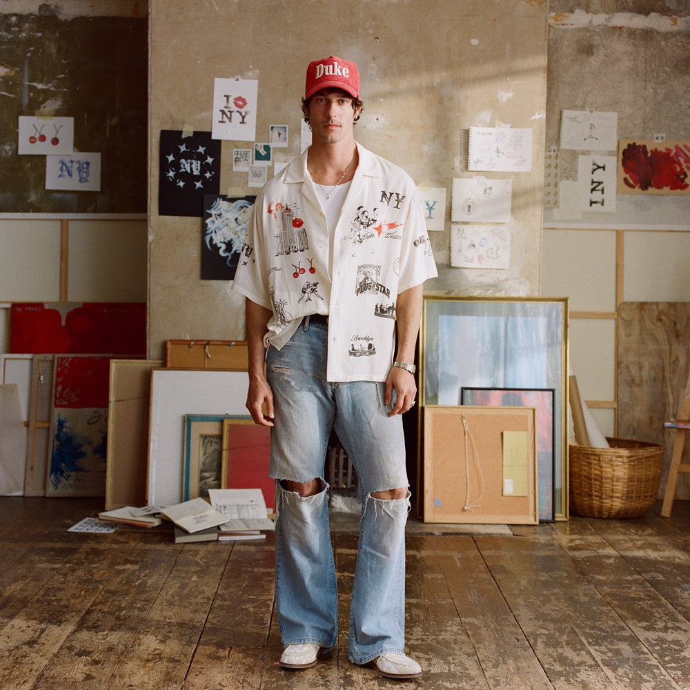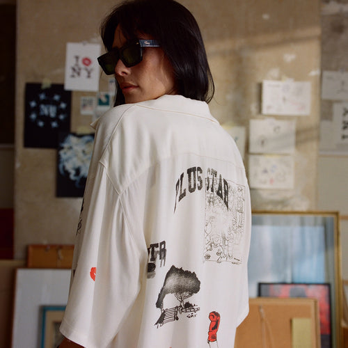 Part of LDN II NYC, this Sketch Shirt is screen-printed with ‘Notes to New York’, from the cuban collar to the open hem. It’s cut for a relaxed fit from fluid rayon and features icons like Plus Star, Kiss and Cherry.