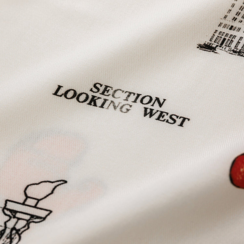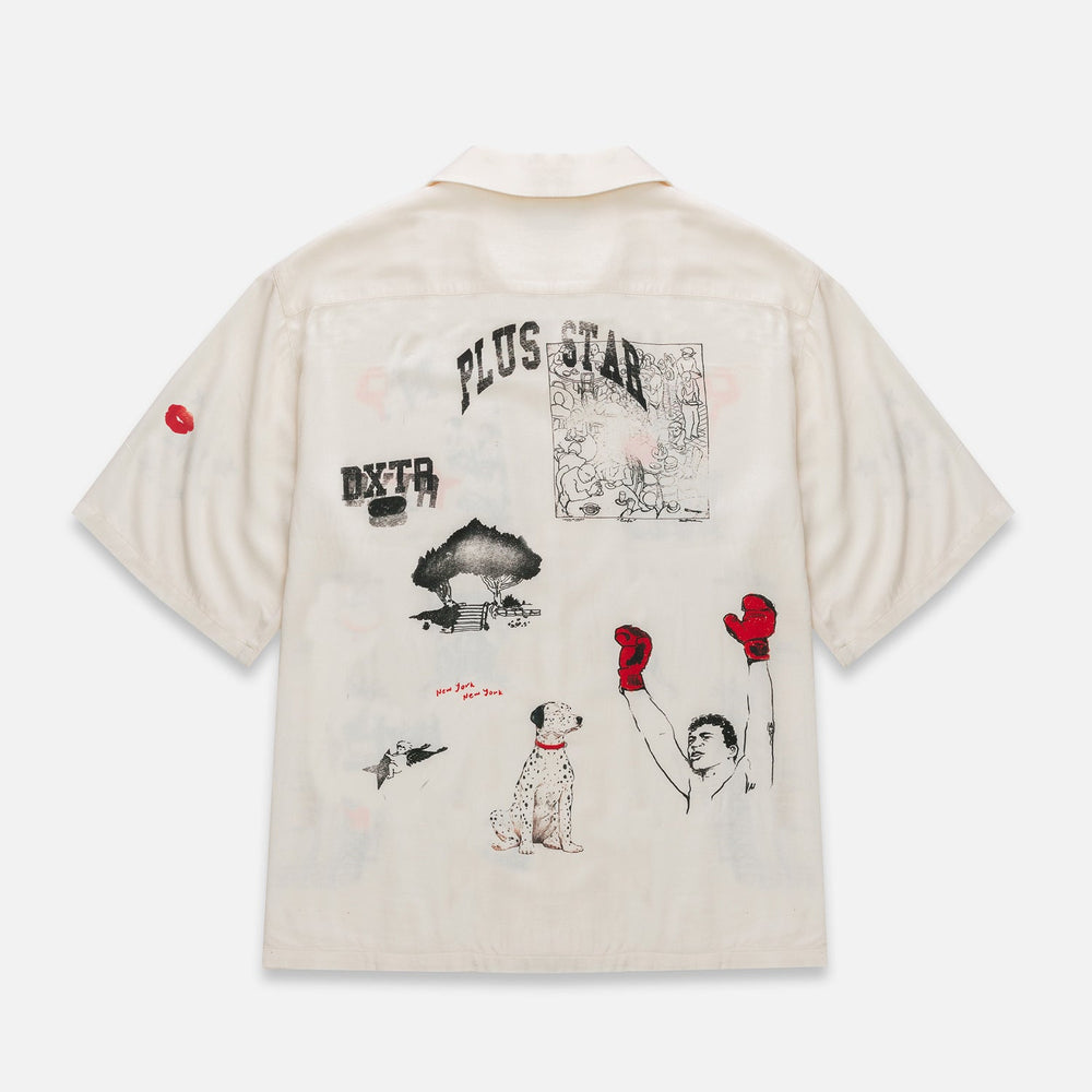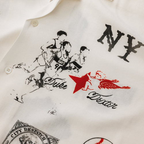 Detail Short sleeves. Cuban collar. Digitally printed all over. Hand-drawn NY sketch artwork. Imitation mother of pearl buttons