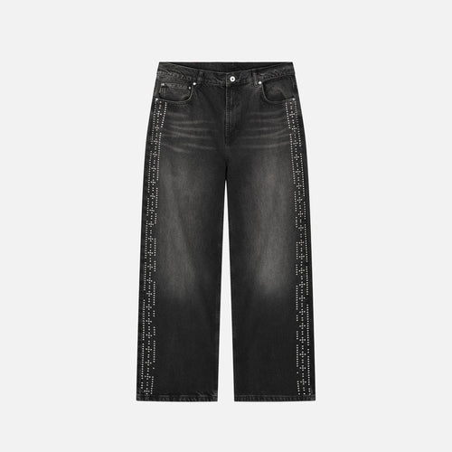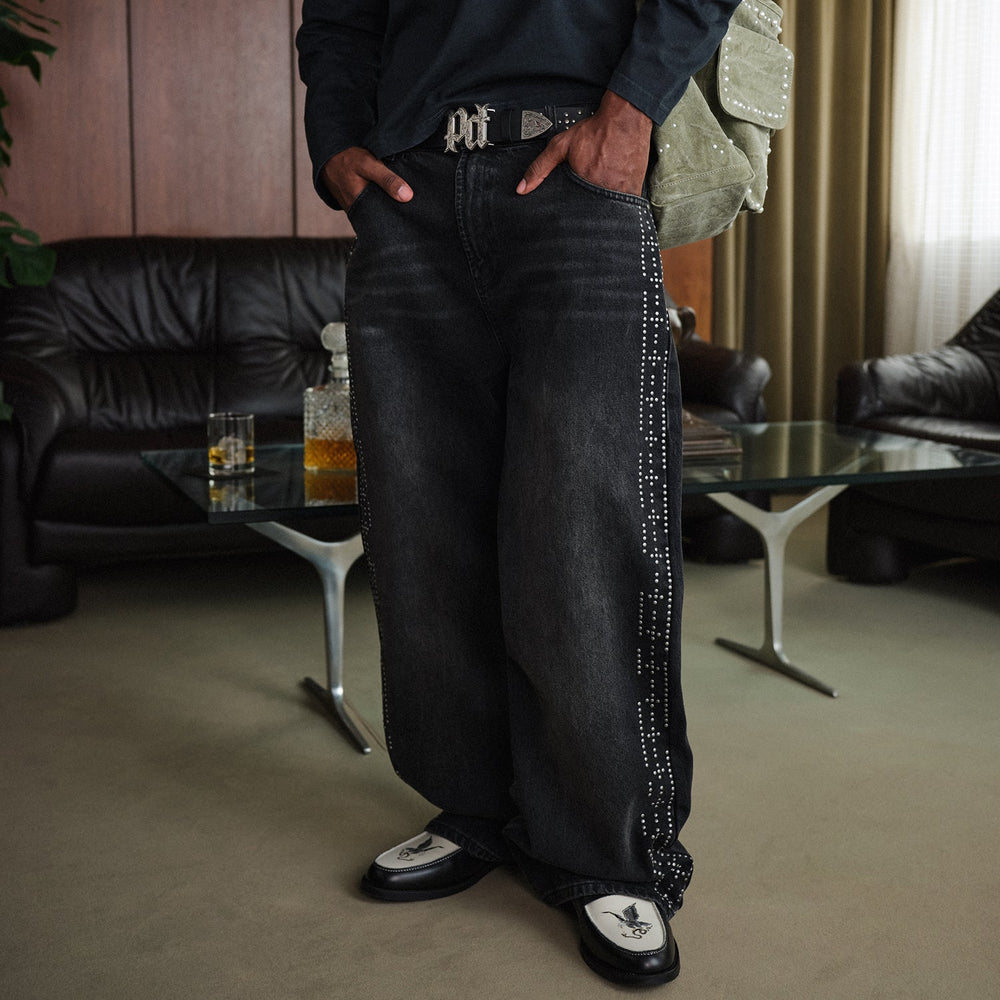 Part of our collaboration with Peso, these Black Jeans are pressed with silver-tone studs along the loose, wide legs. They’re made from mid-weight cotton-denim that’s washed for a lived-in look and feel and stitched with a red leather patch at the back.
