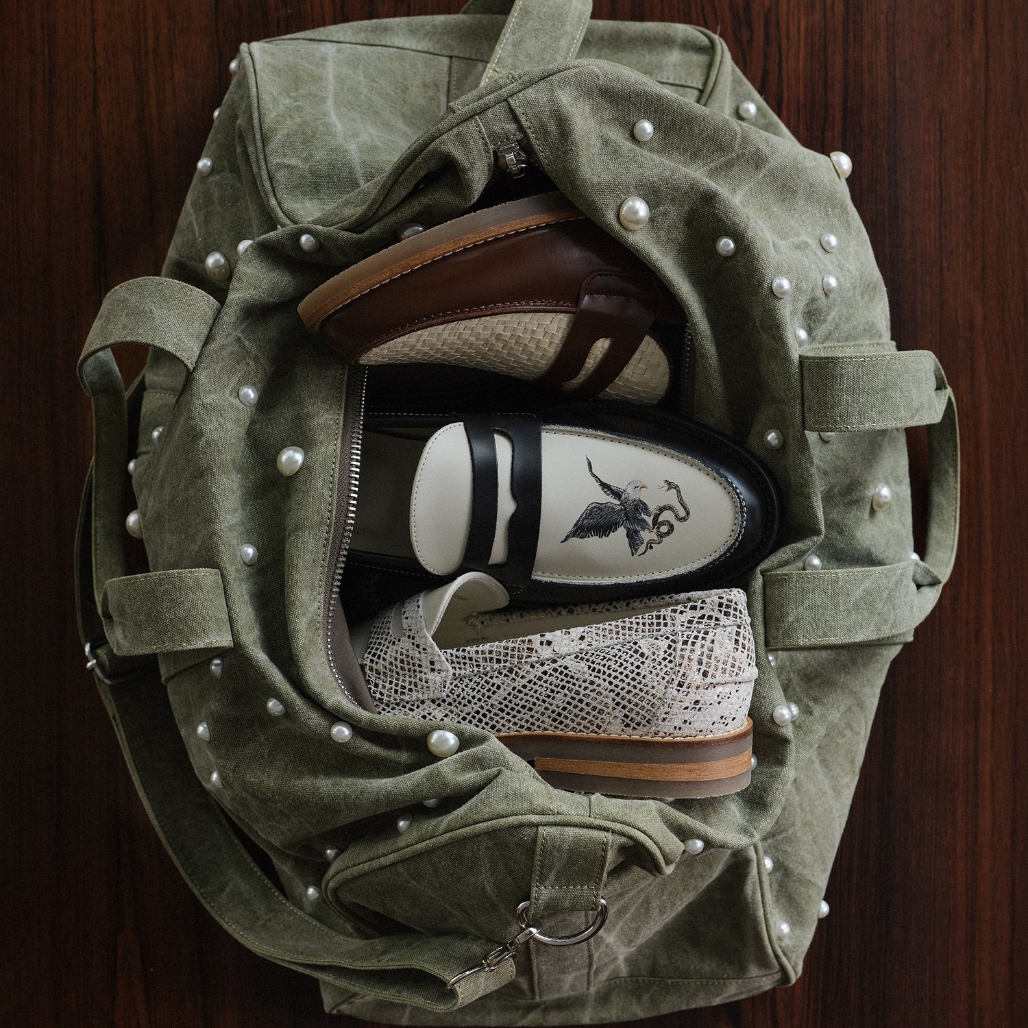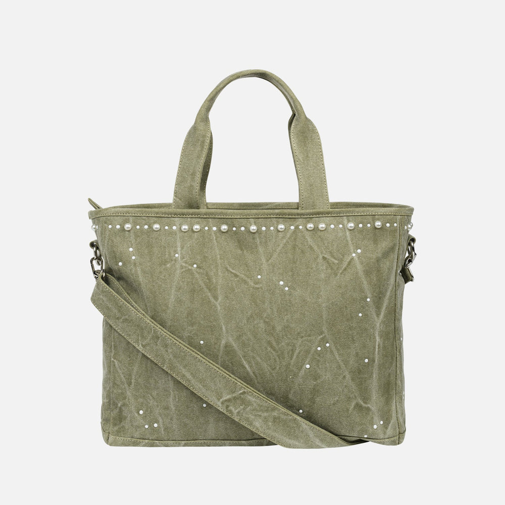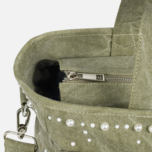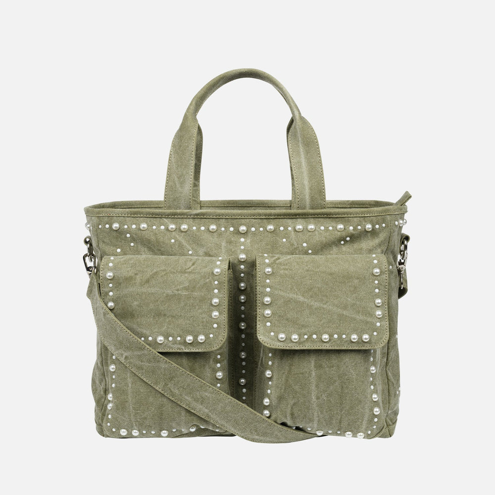 One of our first-ever bags, this Peso Green Pearl Crossbody is made from hard-wearing canvas and covered in faux pearl beads. It’s fitted with a couple flap pockets and a zip-up main compartment with room for your headphones, charger and laptop. The fabric has also been heavily washed to give that aged look and soft feel.