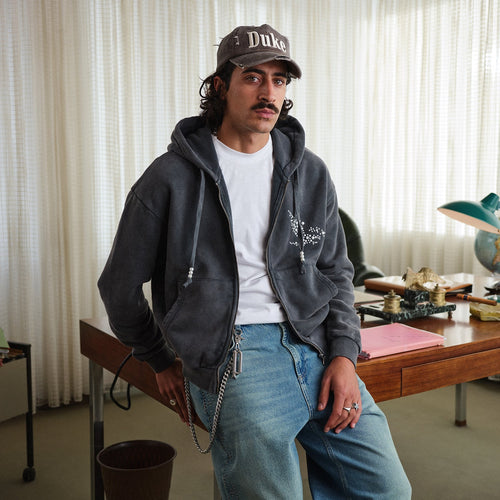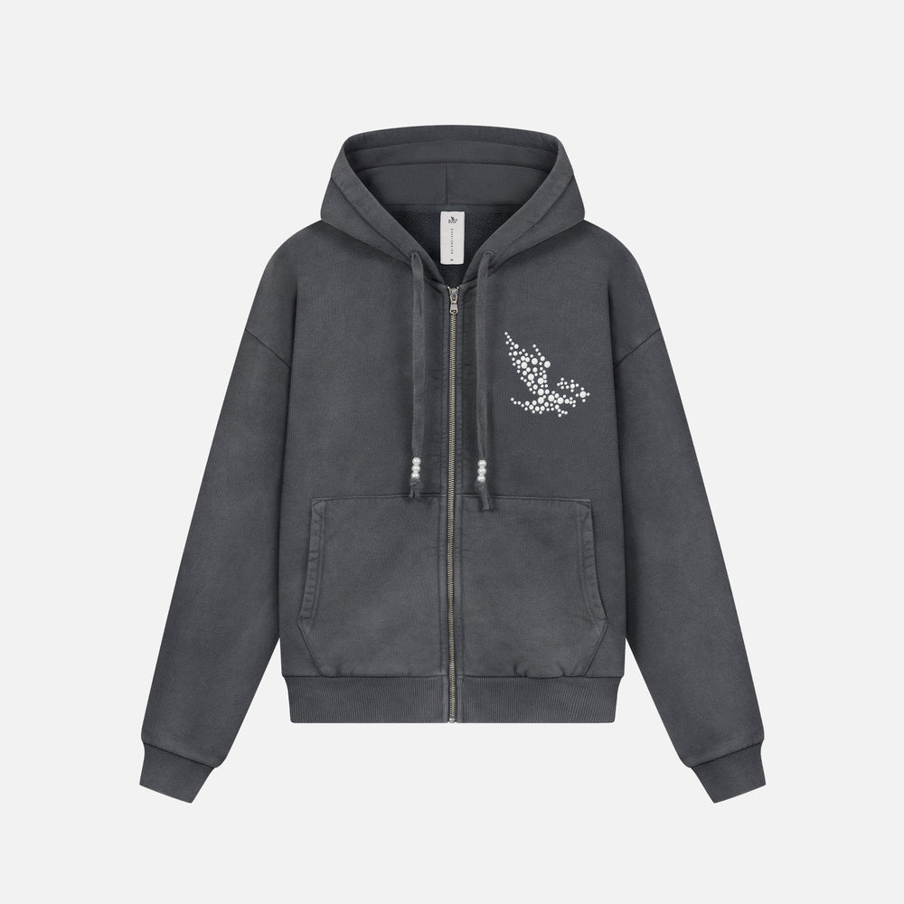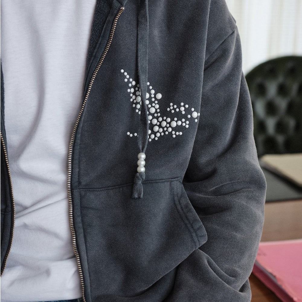 The Zodiac Hoodie is beaded with pearls in the shape of an eagle, the signature of our collaborator, Peso. It’s cut for relaxed fit from mid-weight cotton-jersey and is finished with an aged zip. There are some pearls on the drawstring to match the motif at the chest.