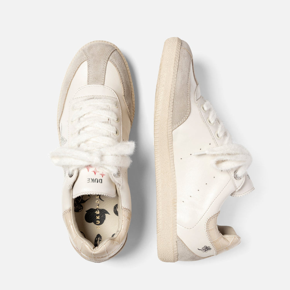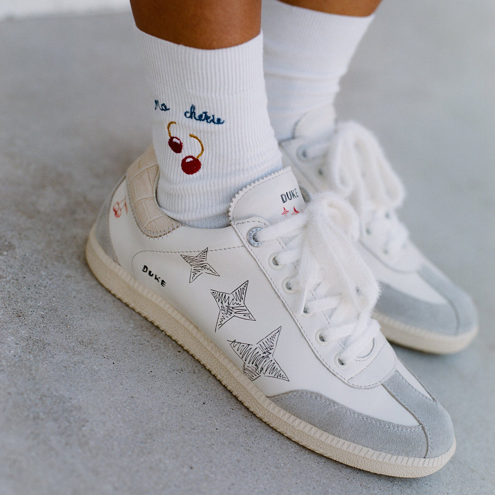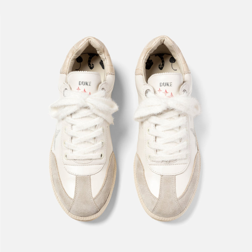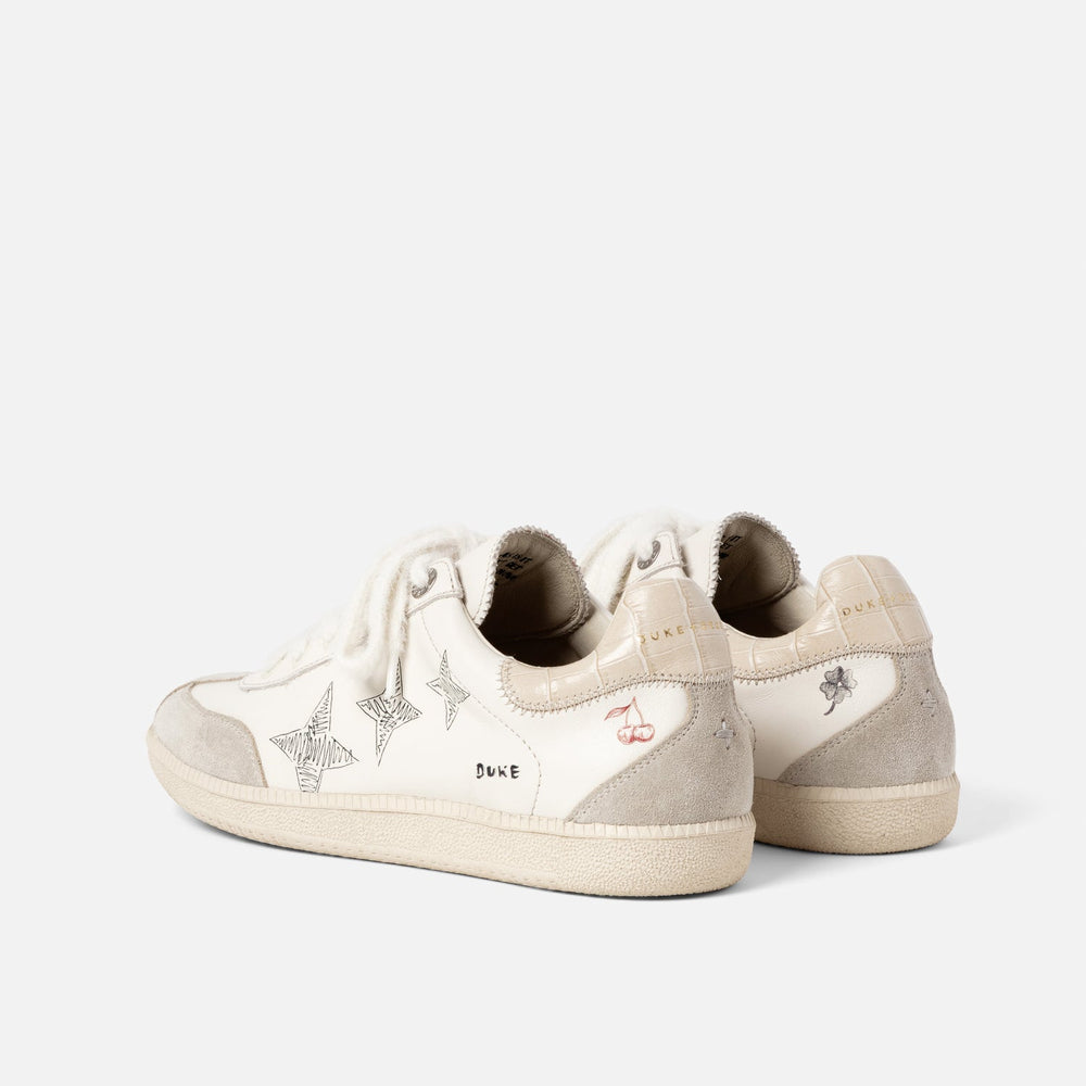 These Plus Duke Sketch Sneakers are an ode to our artistry, with hand-drawn icons like Plus Stars and Cherries along the sidewalls and at the heels. They’re made in Europe from panels of suede, smooth and croc-effect leather and set on slim rubber soles. Details include mohair-style laces, custom-debossed eyelets and removable tongues.