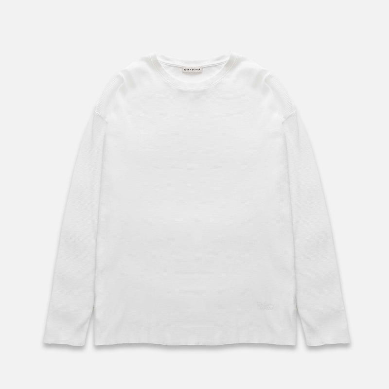 Detail Lightweight custom knitted jersey. Screen print on vintage white