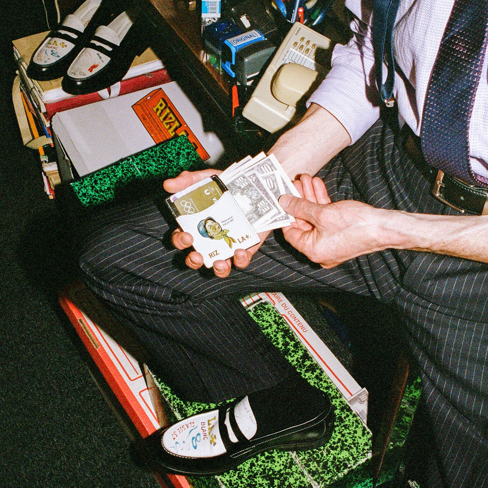 Our exclusive capsule with Rizla features deep cuts from the archives, customised by our in-house artists Jess and Valentino, and screen-printed on loafers, cardholders and smoke-stained tees and hoodies.