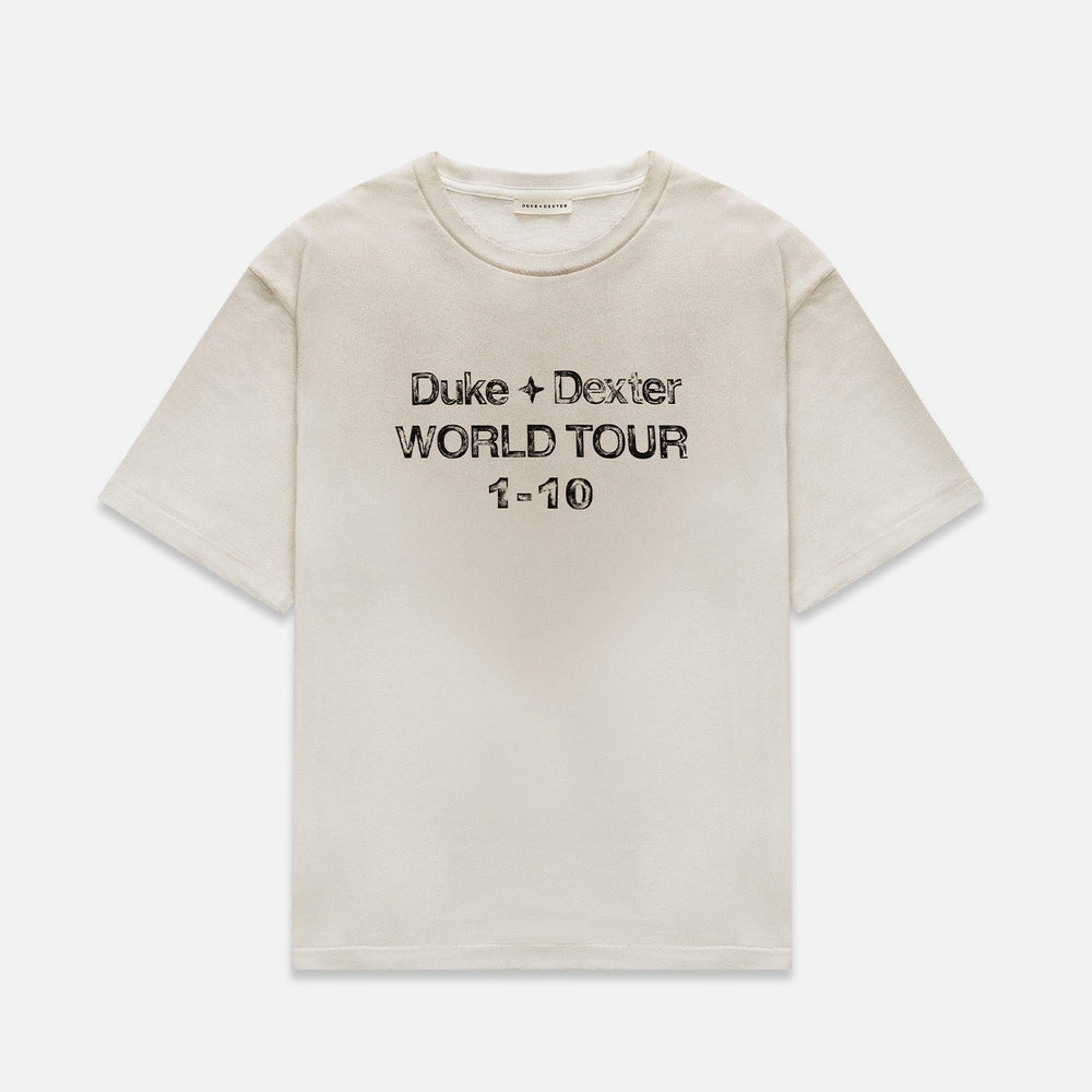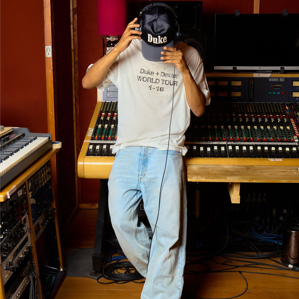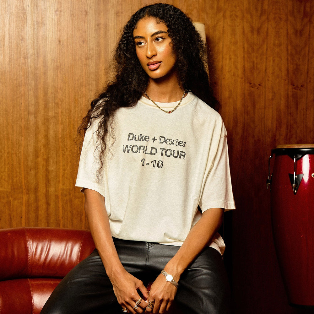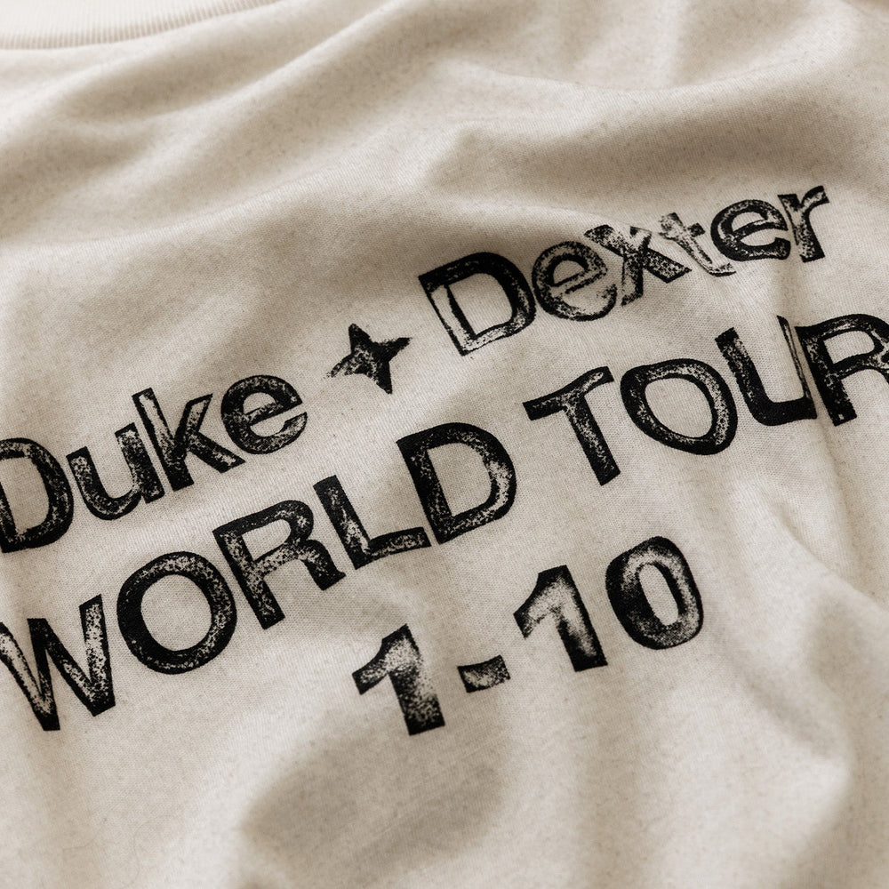 This Vintage White + Black T-Shirt is part of our Duke World Tour collection, celebrating a decade in the business. It’s made from slubbed, 120GSM cotton-jersey and washed-out for the look and feel of vintage. With a dropped shoulder fit, it features single stitch hems and is screen-printed with a spell-out at the chest (using water-based inks, of course).