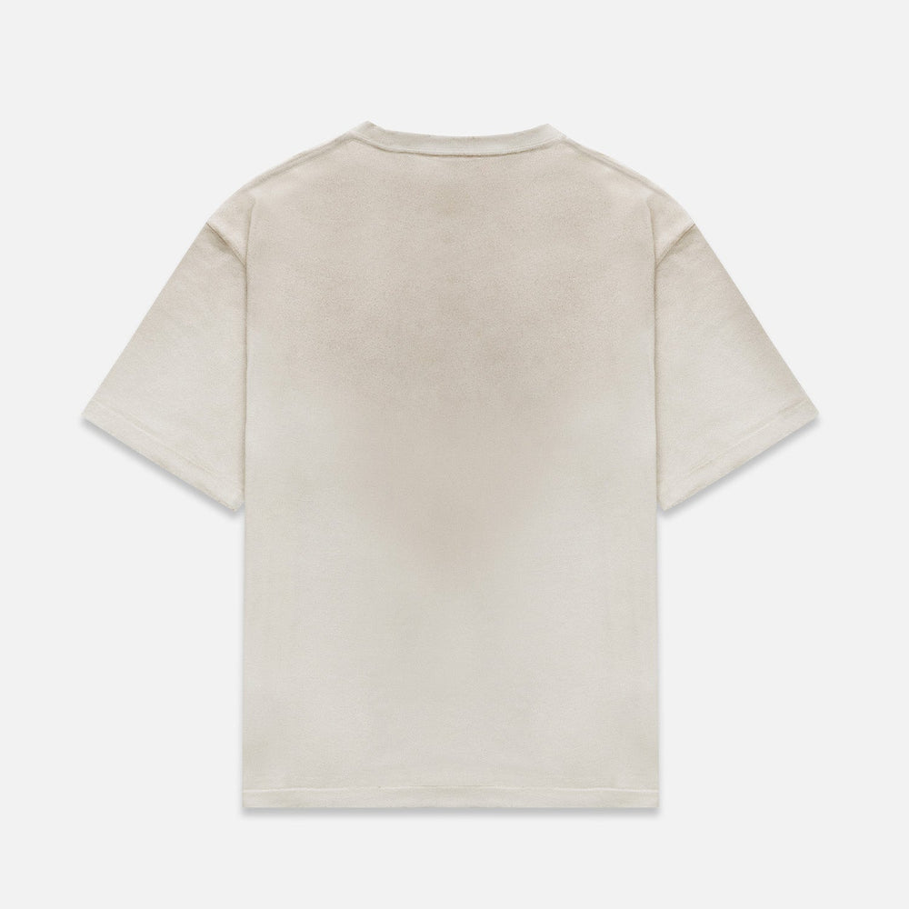 Detail Lightweight cotton slub t-shirt with a vintage wash and sprayed finish. Artwork is a water based screen print on the front