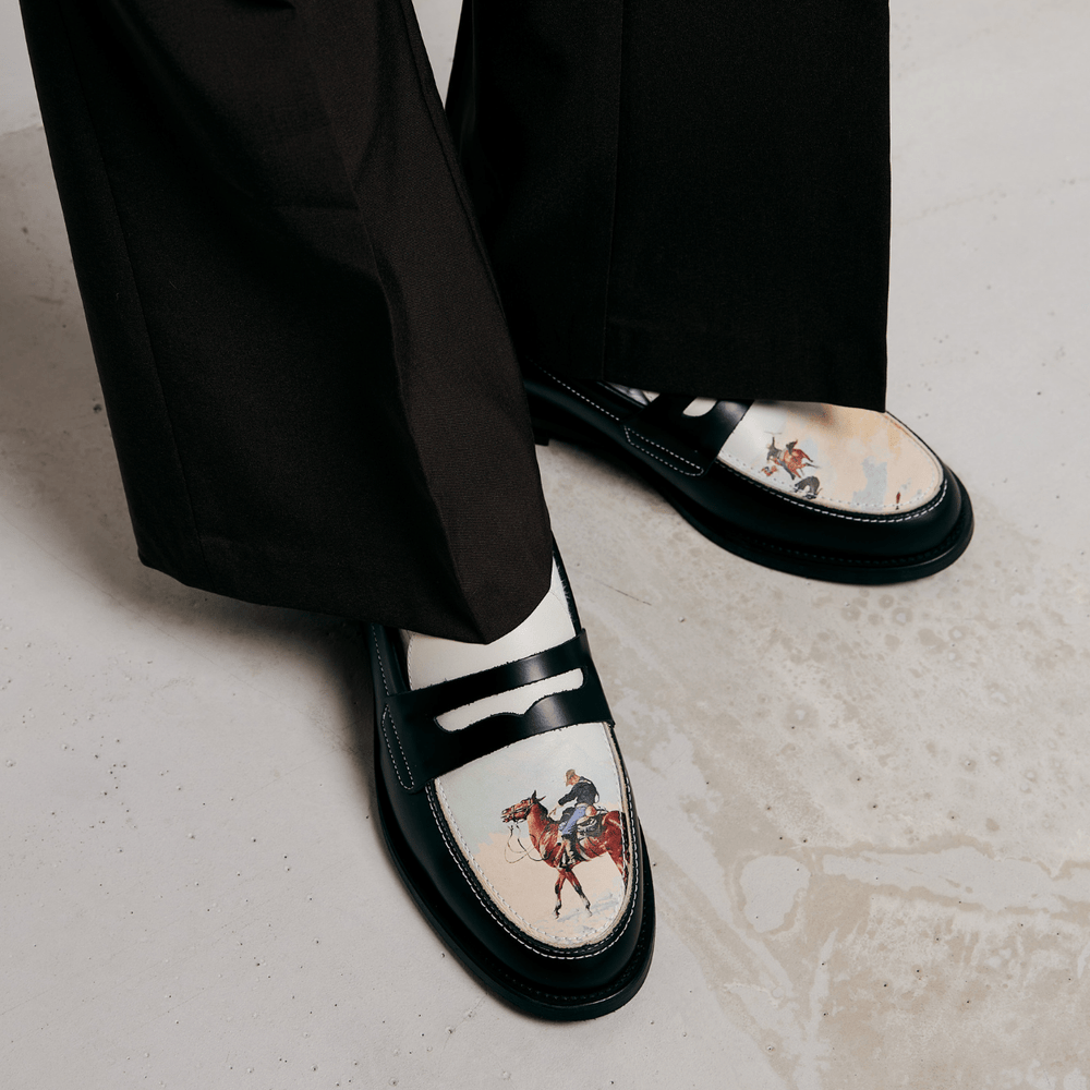 A scene depicting conflict. Way out in the Wild West. Frederic Remington captures the moment a now-distant Sioux warrior picks off a cavalry scout, causing him to slump into his saddle whilst friendly troops flee the scene behind. A moment such as this was of common practise for Remington, who often romanticised American West concepts from his New York Studio. Digitally printed onto the contrasting vamp of our Wilde Penny Loafer. Featuring a 25mm handmade prefabricated TPU sole underfoot.