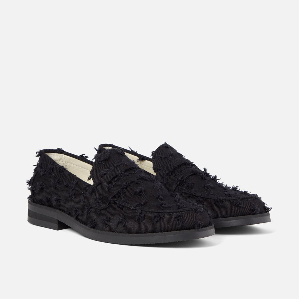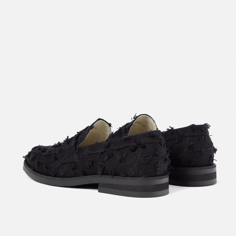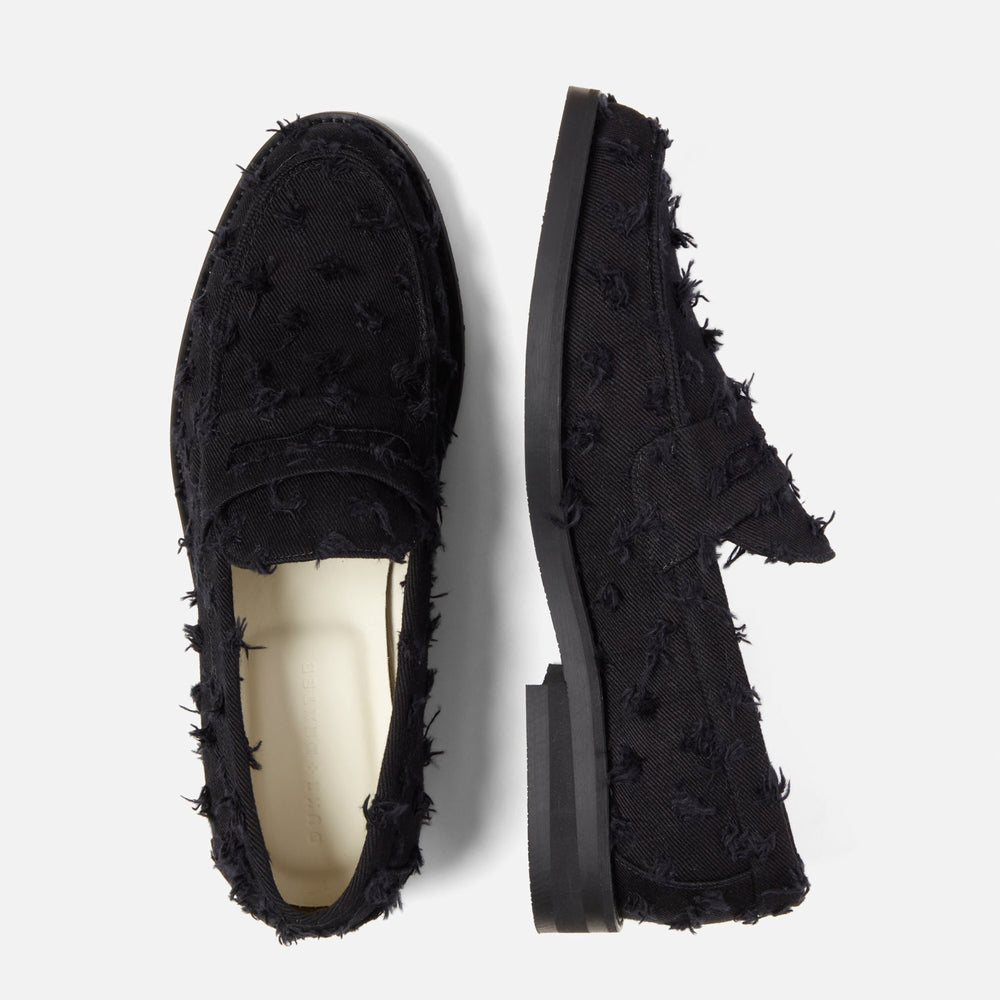 Our Punched Denim Penny Loafers are handmade from a black, twill-weave fabric and distressed using a punch-needle technique. They’re set on 25mm compounded soles and have an all-new cushioned insole for added padding. The base is embossed with our icons, including snake, kiss and cherry.