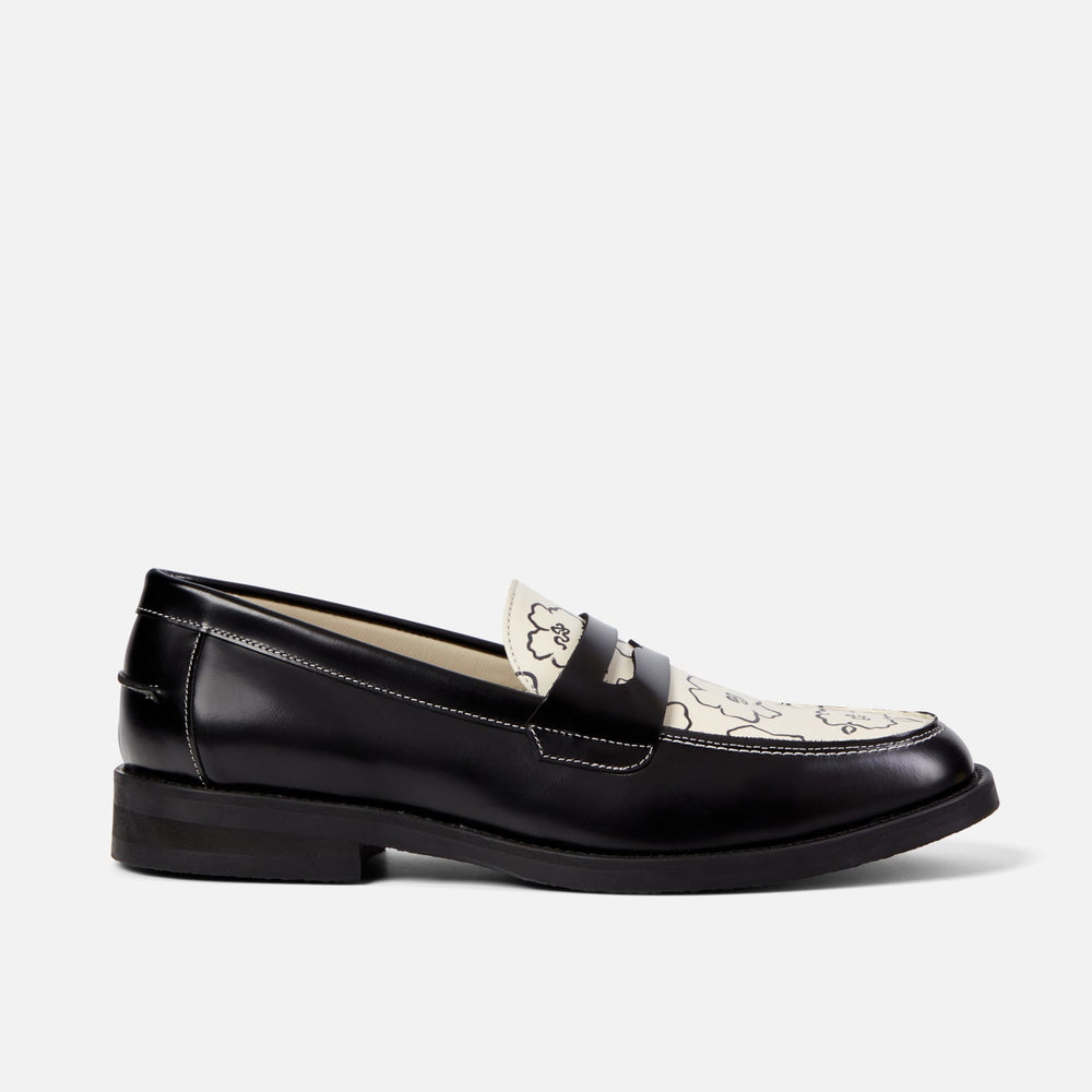 The Wilde Black Sketch Floral Penny Loafer is a part of our Floral Pack. Sat atop a 25mm handmade prefabricated TPU sole underfoot.