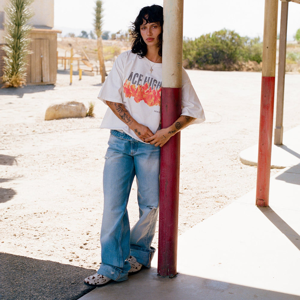 Ace High is an ode to the American West. Featuring footwear, apparel and accessories, updated in Western-inspired textiles like cow-print, pony hair and snake-effect leather and printed with ranch and rodeo-themed artwork from in-house artist, Valentino.